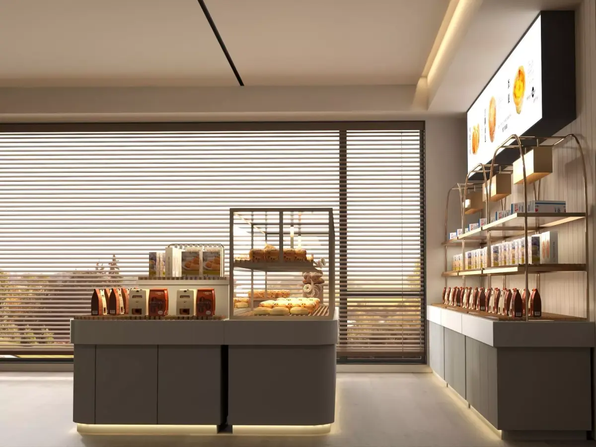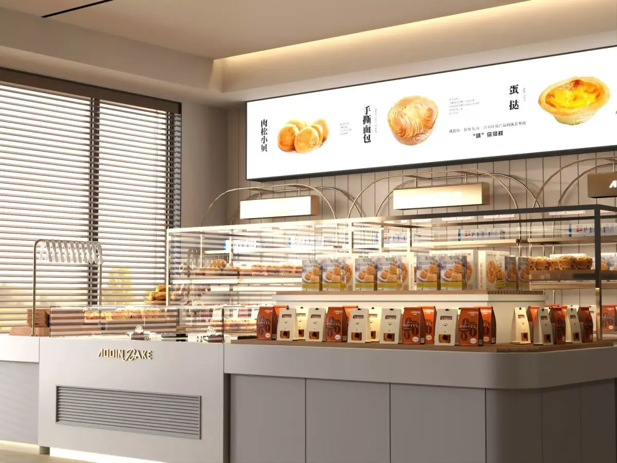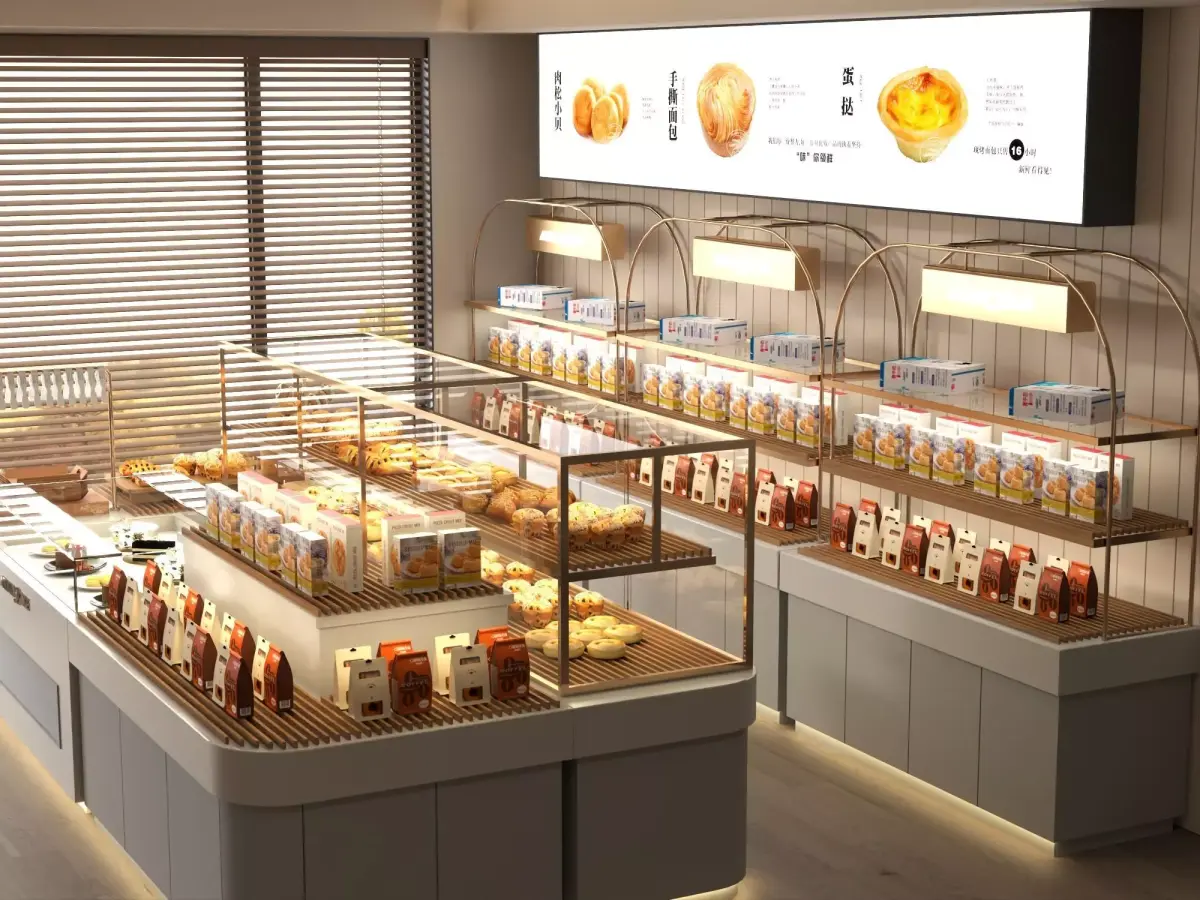 This is a high-quality 3D model of a modern bakery display counter, designed for bakery, café, and pastry shop interiors. The scene features realistic bakery display cases, storage units, and professional café equipment, ideal for architectural visualization, retail design, and commercial interior presentations.