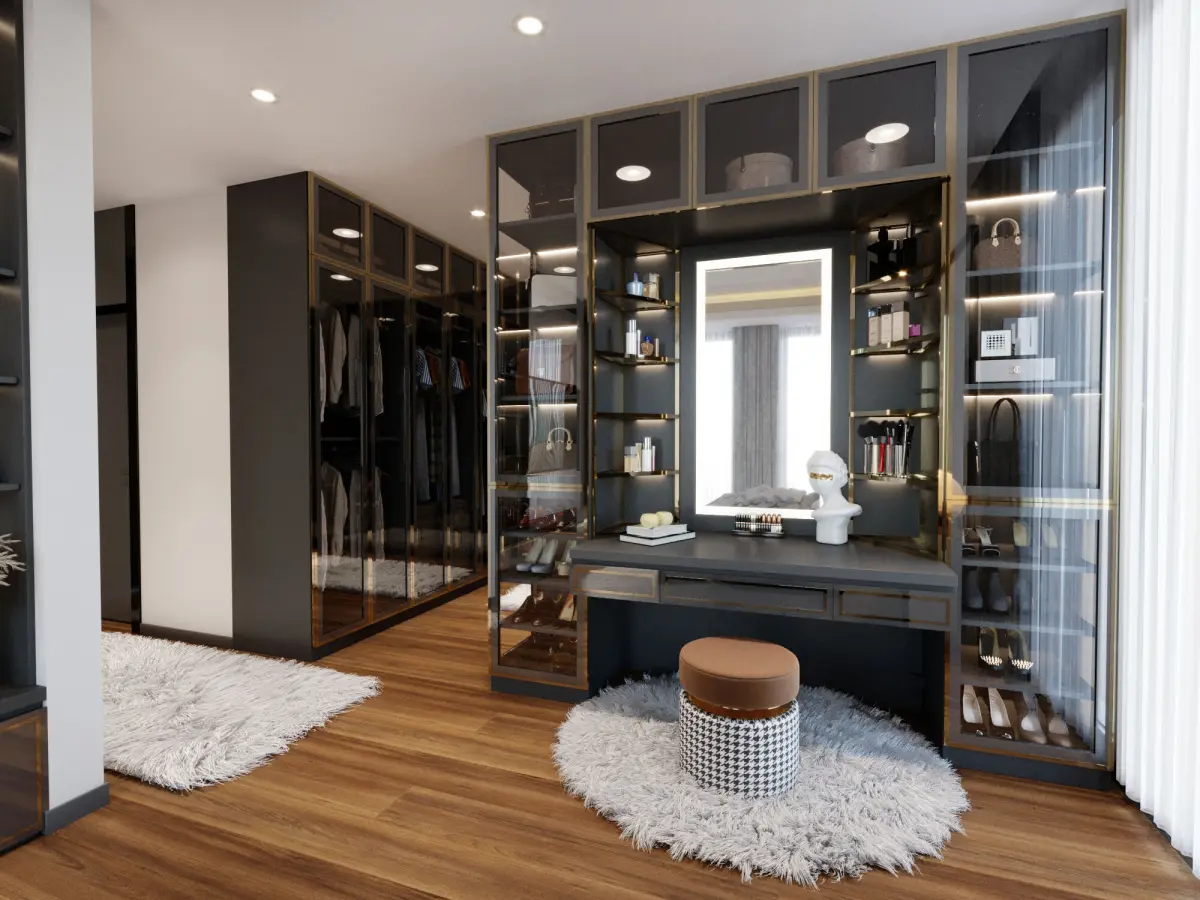 This modern bedroom 3D scene presents an elegant and stylish interior designed with a perfect harmony of black, gray, white, and wood tones. Combining comfort and aesthetics, this room is equipped with contemporary designs. The headboard is highlighted with marble details, and the bed is upholstered with fabric that has a modern texture. The wooden floor and minimalist walls enhance the spaciousness of the space, while the gray and white tones create a peaceful atmosphere. Simple and sleek lighting illuminates every corner of the room, providing a relaxing environment. The attention to detail strengthens the sophisticated ambiance of the room, offering a modern living space from every angle. This scene serves as an inspiring example, especially for those interested in modern interior design.