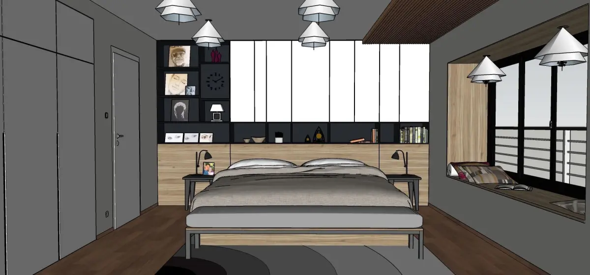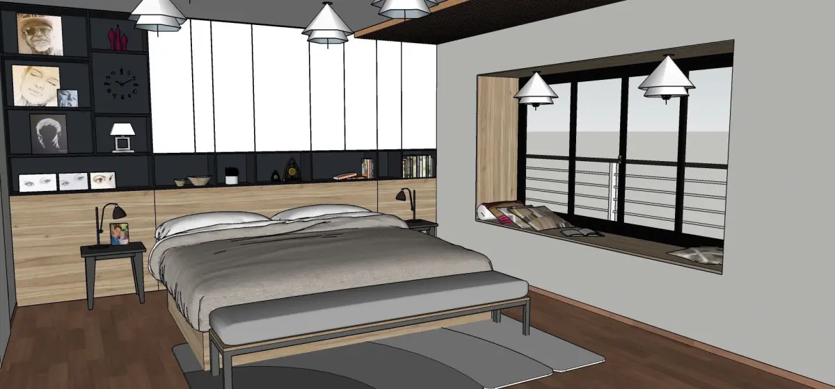 Modern designed bedroom 3d model with reading corner.Unique designed,modern,highly detailed model with lot of useful 3D models in it.Also feature a paintings from my friend. Unique feature are wooden parts on ceiling and reading corner with window view .Model is done with sketch up and rendered with v-ray. All textures and furniture equipment are in high resolution,have been checked and are included in scene.Textures are compressed in zip file.Model is easy to manipulate and ready to render with v-ray.