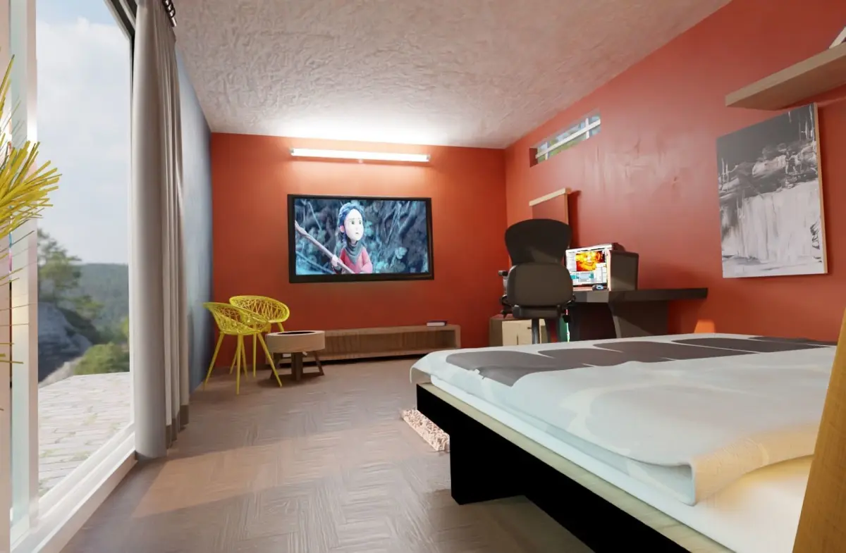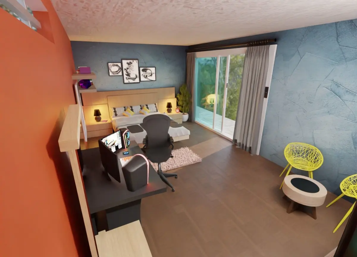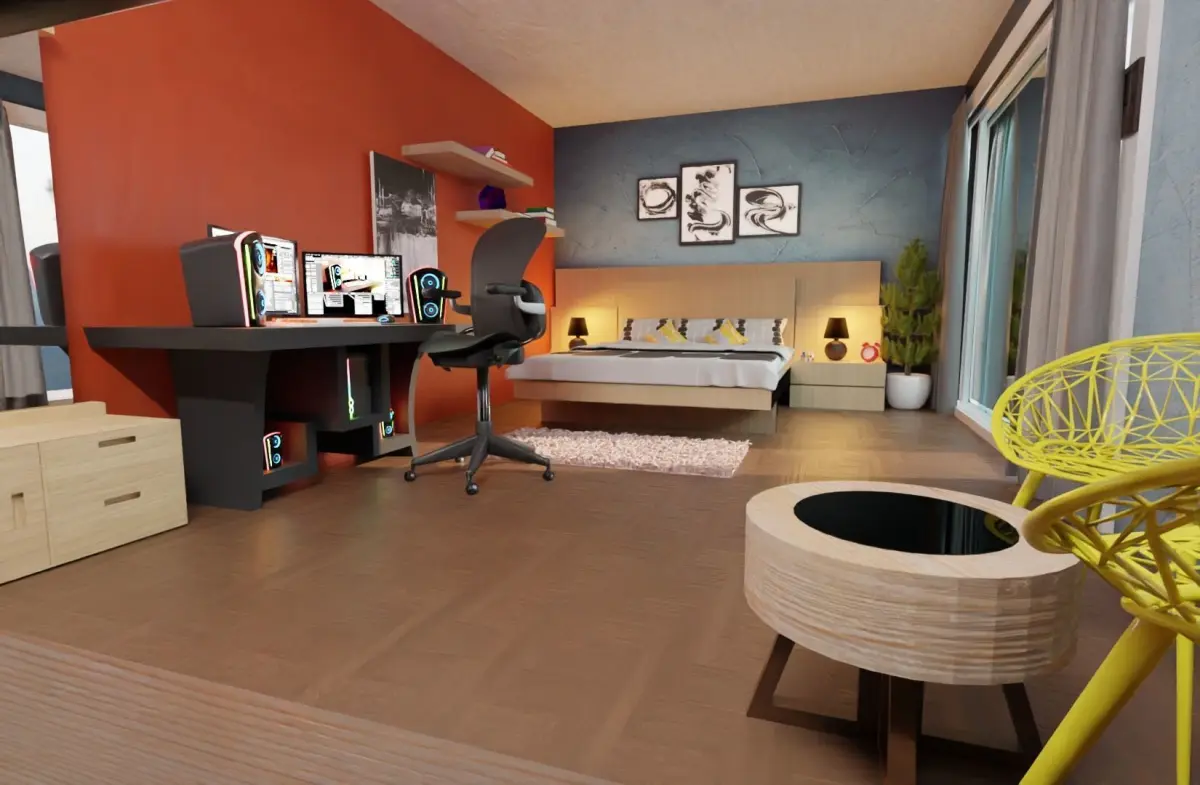 It consists of:A full bed set upA PC set upGlass Door cum window with curtains Sitting area with two chairs and a table A PC chairA dressing tableA wooden chairA TV with a TableAnd so many different objects to fill out and decorate the scene like lamps, rubix cube, books plant, etc
