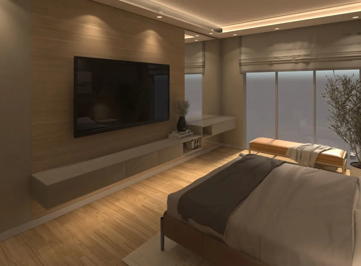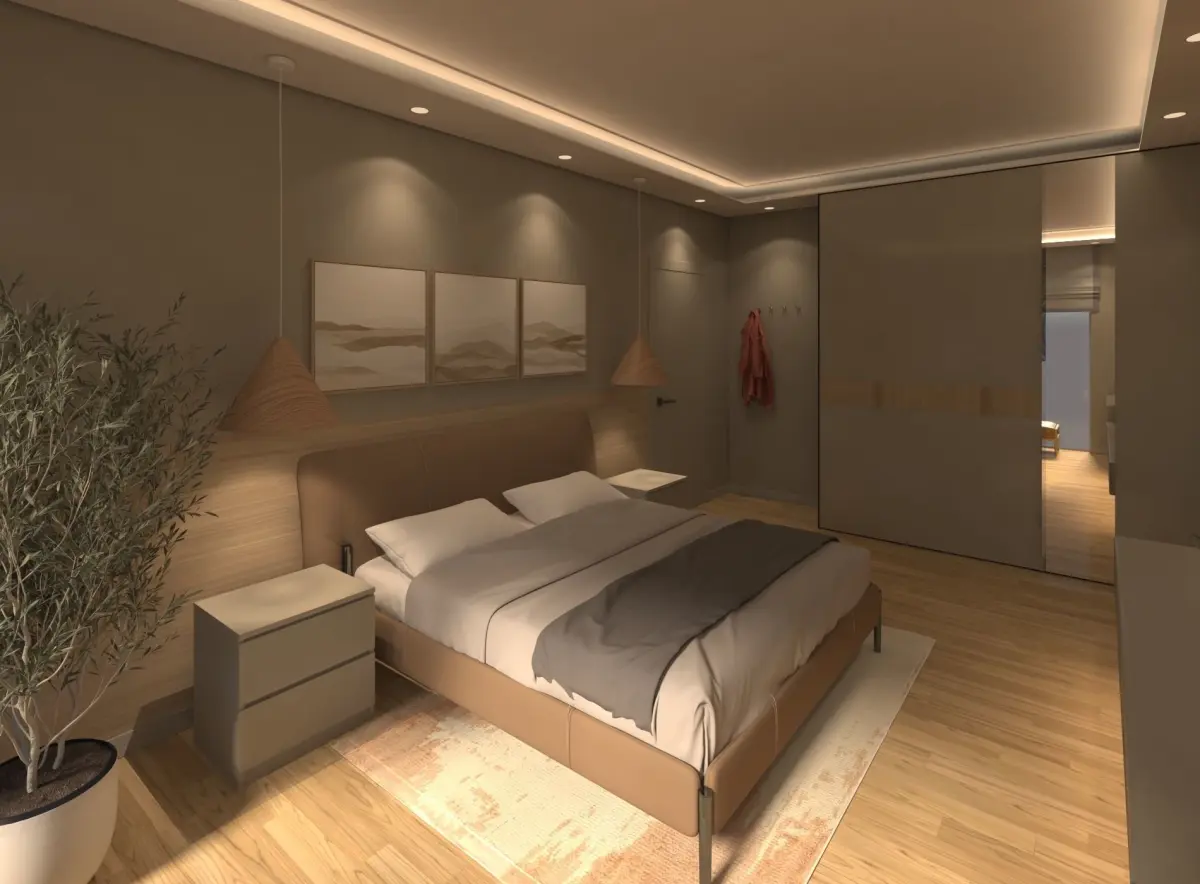 A modern bedroom with warm and neutral color scheme. I used 3dmax and V-ray next for this model and all the furniture pieces are proI used four sources of lighting: Sunlight, spotlight, pendant light and hidden light.