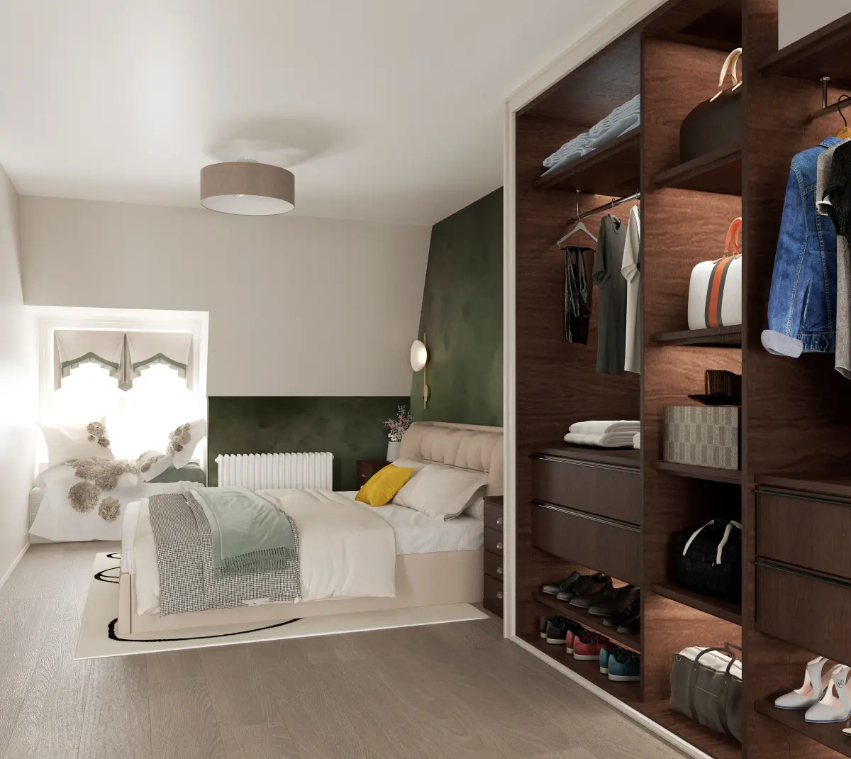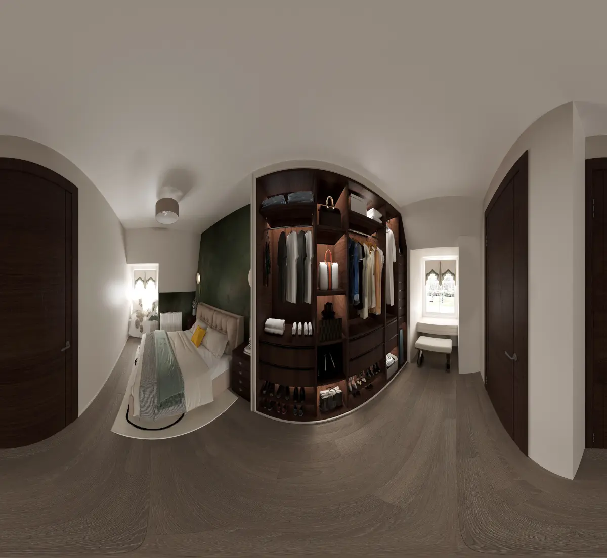 Modern Bedroom Interior Scene + 360° Panorama View | Virtual Tour Ready | 3ds Max + Corona RendererThis 360° panoramic bedroom scene delivers a stylish modern interior with a fully immersive viewing experience. Designed for comfort and sophistication, this virtual-ready setup is ideal for showcasing spatial planning, materials, and lighting in a single interactive render.Created in 3ds Max + Corona RendererIncludes 360° camera setup for panoramic renderingFully textured, real-world scale, and lighting optimizedIdeal for VR experiences, real estate walkthroughs, or interior design presentations Interior Highlights:Bed: Low-profile modern bed with premium bedding and cushionsSide Tables: Floating or minimalist with lamps and booksWardrobe: Sliding or open-shelf wardrobes in wood or matte finishesLighting: Ceiling ambient light, wall sconces, bedside lampsFlooring: Warm wood or large-format tile with an accent rugDecor: Framed artwork, plants, mirror, soft curtainsPalette: Neutral tones like white, taupe, and charcoal with soft contrastsPerfect For:Virtual staging and real estateArchitectural and interior design presentationsVR and 360° interactive portfoliosFurniture visualization and product showcasesImmersive client experiences and walkthroughs