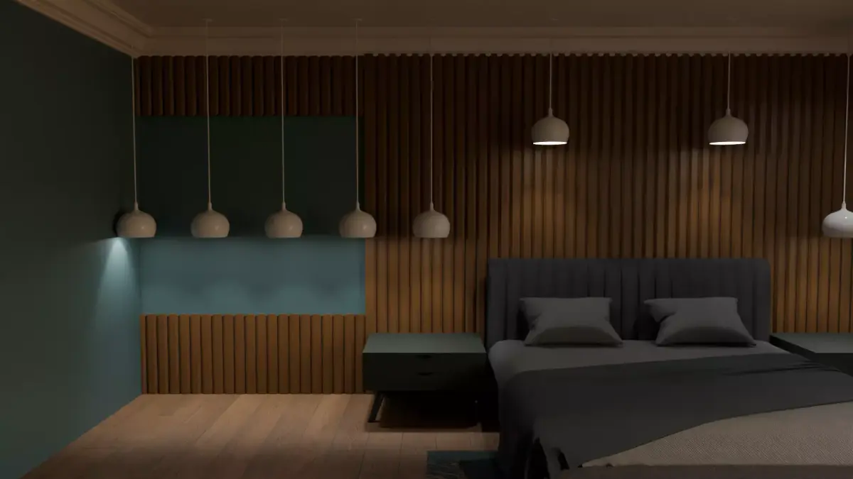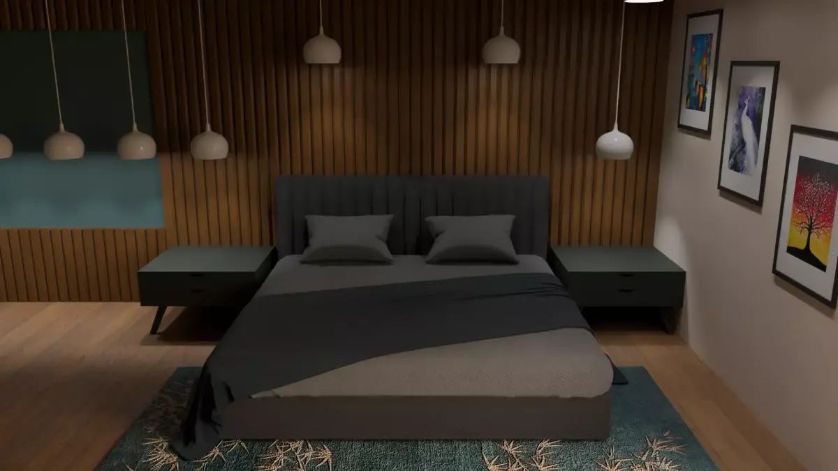 This 3D model features a beautifully designed modern bedroom interior, created with a focus on realism, detail, and functionality. The scene includes a stylish double bed with pillows and blanket, elegant hanging pendant lamps, wall-mounted artwork, sleek bedside tables, wooden flooring, and a decorative rug for added warmth. The wall design combines vertical wood paneling with neutral tones, giving the room a luxurious yet cozy atmosphere.