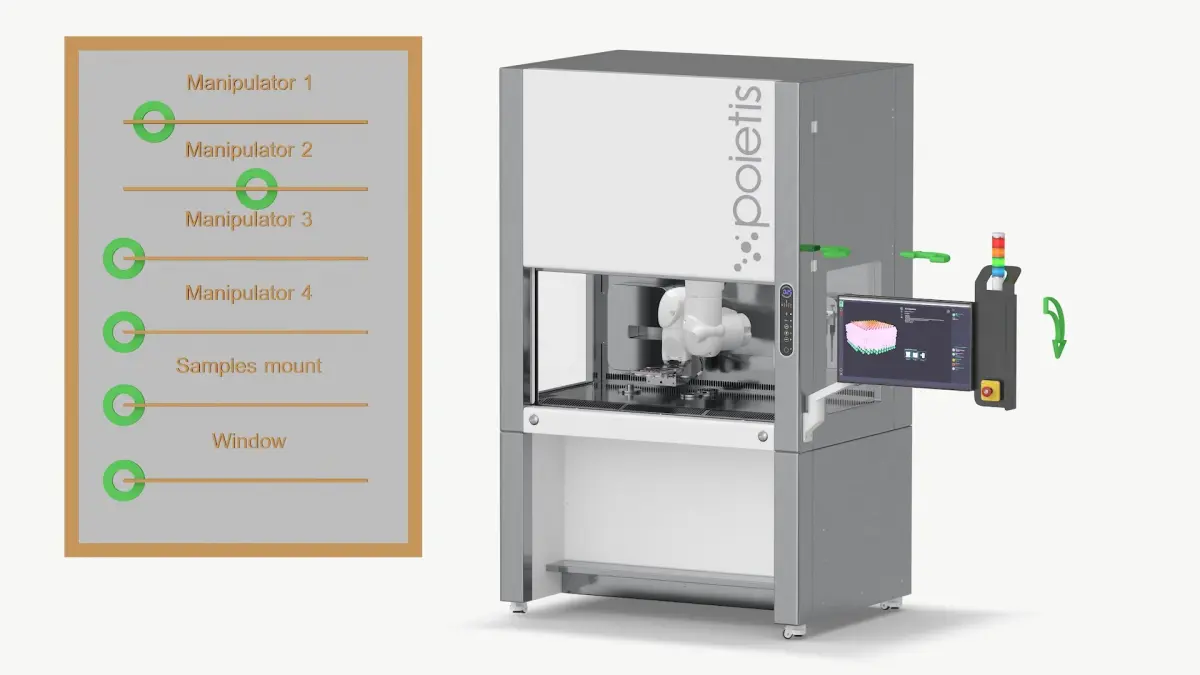 This cutting-edge device integrates a robotic arm with a user-friendly interface for controlling complex 3D biological structures. It employs laser-assisted bioprinting technology, allowing for high-resolution tissue fabrication and precise cell placement, making it a key tool in biomedical research and development.