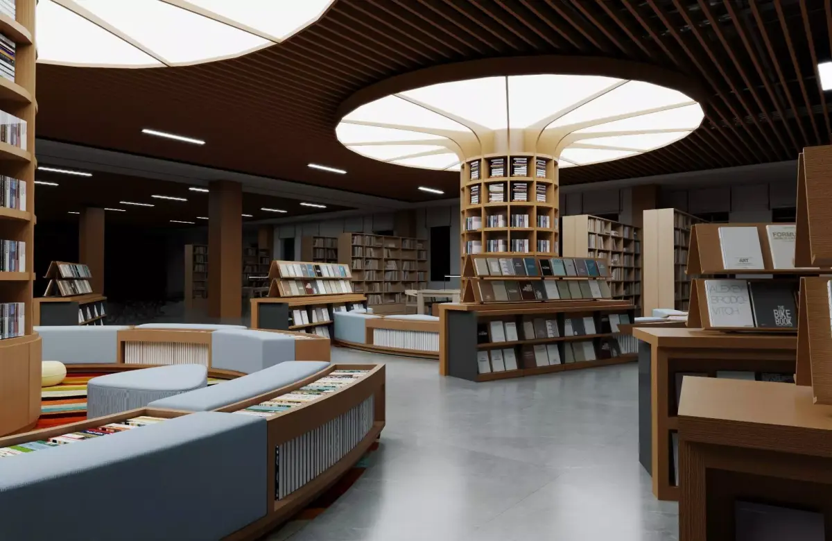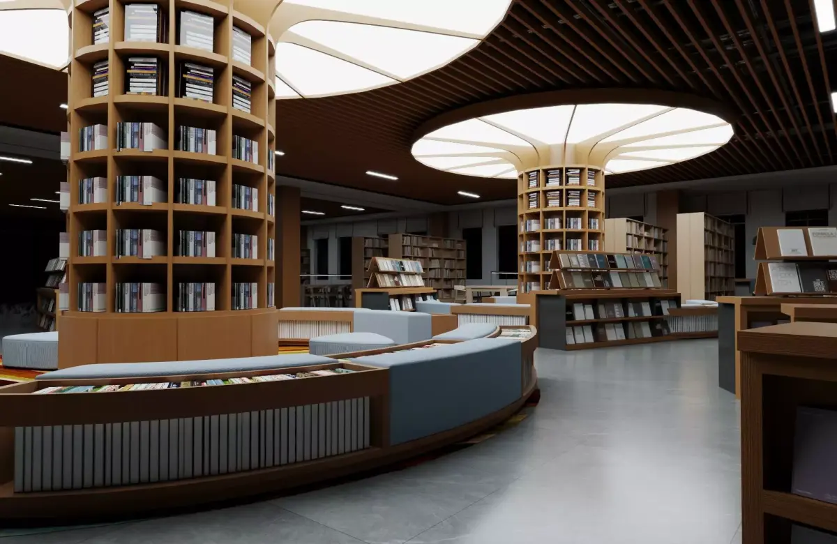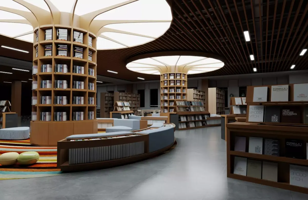 This high-detail 3D model captures a contemporary bookstore or library interior featuring unique organic wooden structures resembling tree branches supporting curved cylindrical bookshelves filled with books. The space includes a cozy reading area with curved seating, colorful striped rug, poufs, display racks for magazines, pendant lights, and a modern wooden slat ceiling with integrated lighting. Perfect for architectural visualizations, interior design projects, animations, VR experiences, or game environments. Clean topology ensures easy editing and high-quality rendering.
