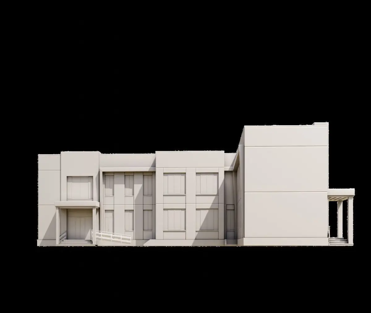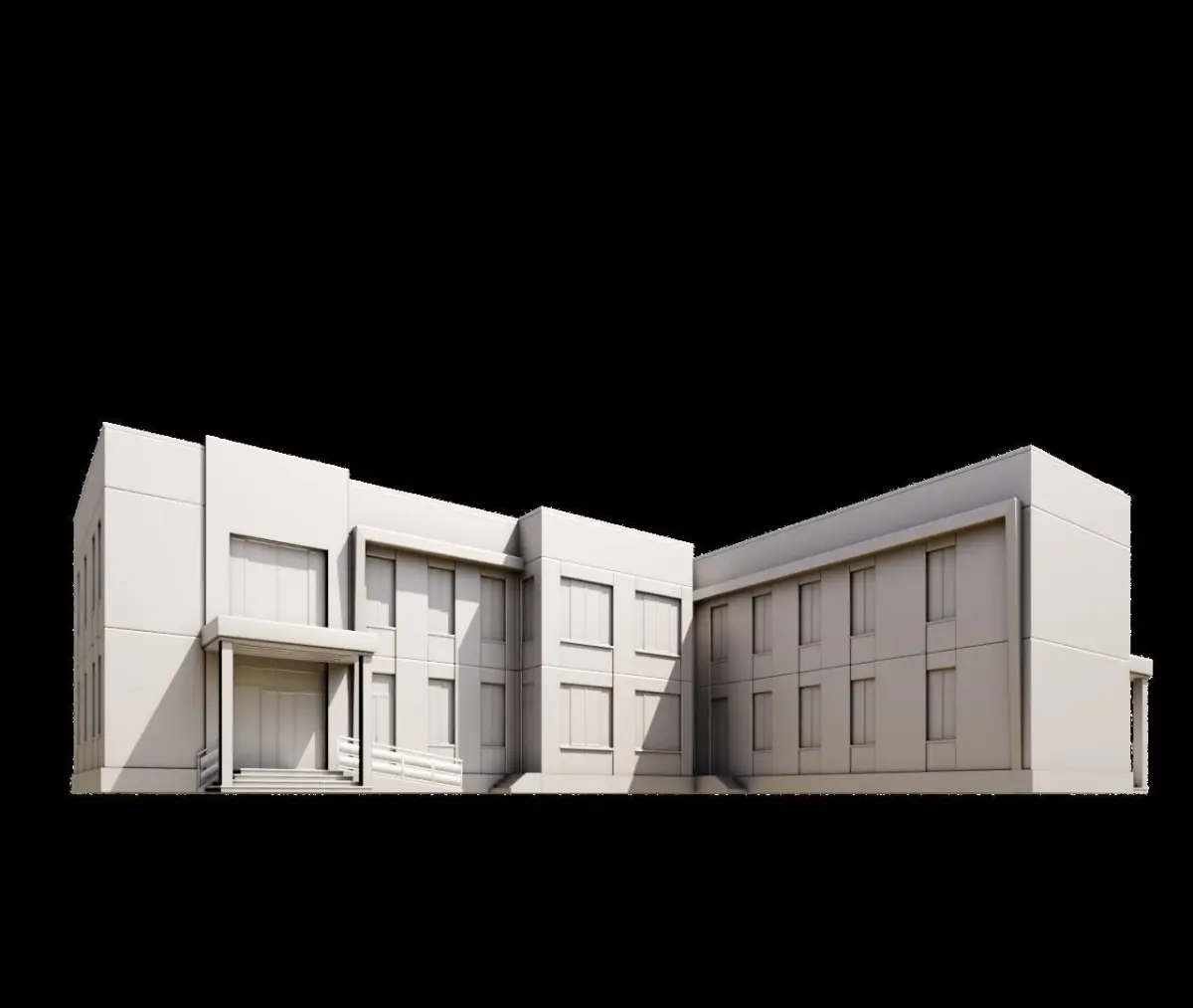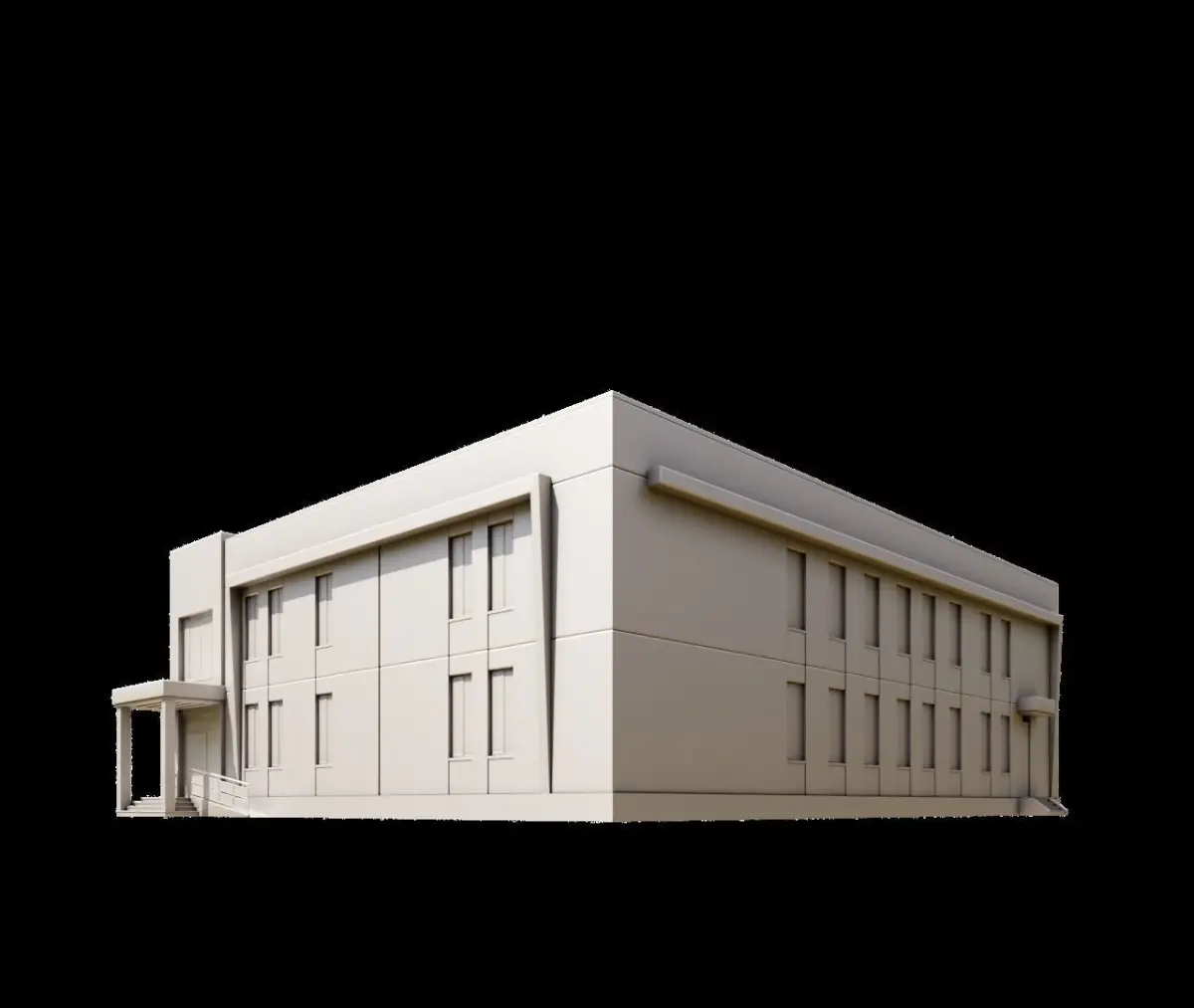 This is a 3D model of a modern building that features a combination of brick and smooth, light-colored surfaces. The design is sleek and geometric, with large windows that allow for natural light. The building has two entrances, one on the front and one on the side, and an extended structure that could serve as a patio or an entrance area. The building is suitable for commercial or residential purposes, as it offers a contemporary and spacious aesthetic.