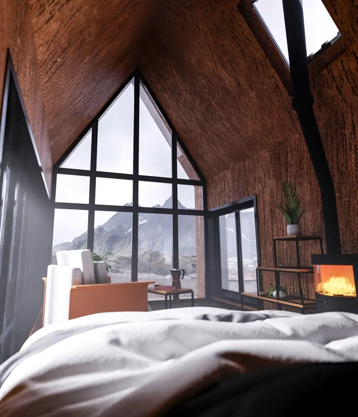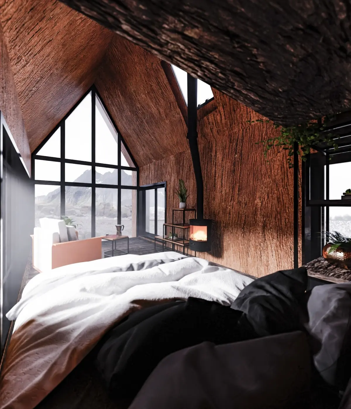 - Brazilian design armchair-Modern metal bookshelves-Plants-Scanned rocks