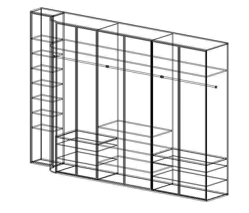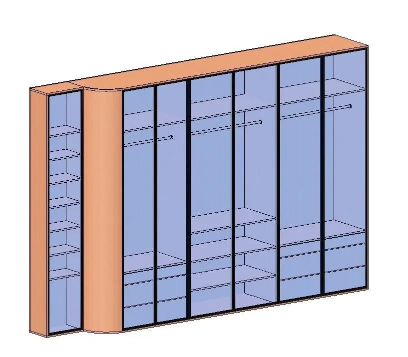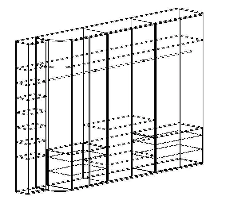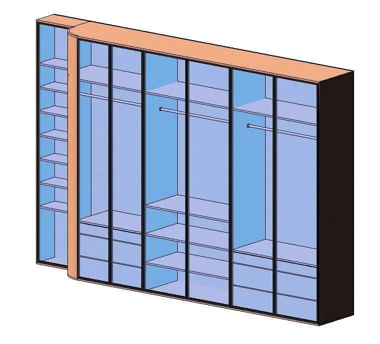 Model of a wardrobe with glass doors and full interior shelf, hanger and drawer designs.