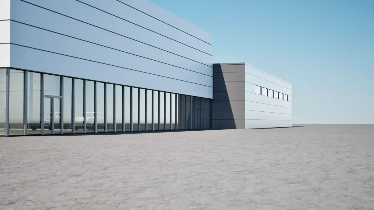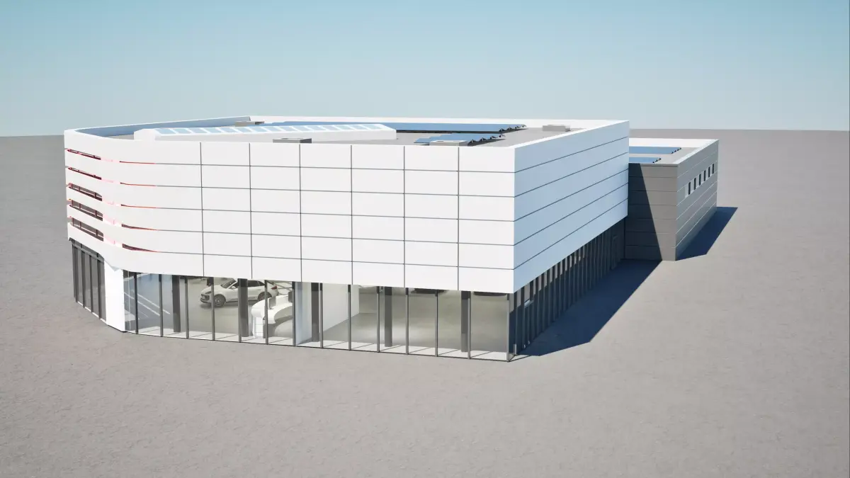 Enhance your projects with this highly detailed 3D model of a modern car dealership, perfect for visualizations and architectural presentations. The model features all the architectural elements of a sleek, contemporary car showroom, highlighted by clean lines, large glass windows, and a modern facade.