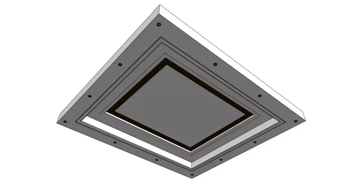 This 3D model features a contemporary, multi-layered ceiling panel design, perfect for modern interior spaces. It showcases a sleek and clean geometric design with a square frame and evenly spaced details, designed for minimalistic yet elegant aesthetics. The structure includes flush mounting with visible fasteners around the edges, making it ideal for use in commercial or residential projects, particularly for high-end interior design. The panel can be used in office spaces, living rooms, and other contemporary environments. This model can be used for visualizations, architectural renders, and more.