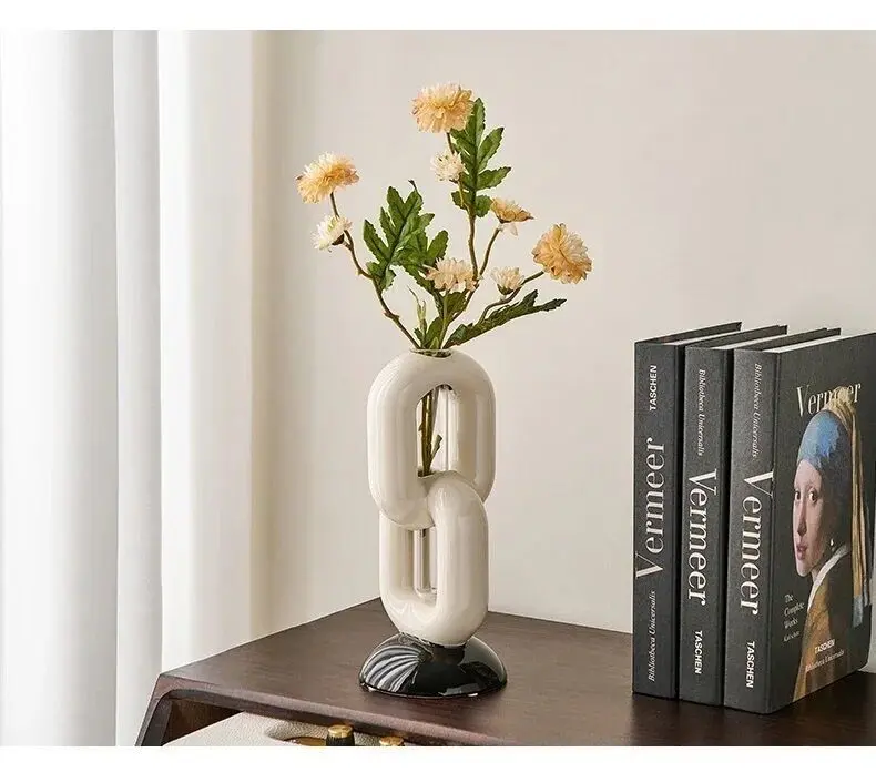 The Modern Chain Flower Vase is a striking decorative object that fuses modern design with minimalistic elegance. It features a geometric structure composed of layered, striped patterns and smooth curves, giving it a sophisticated, artistic feel. This hollow design works beautifully as a standalone sculpture or as a decorative holder for dried or artificial plants.