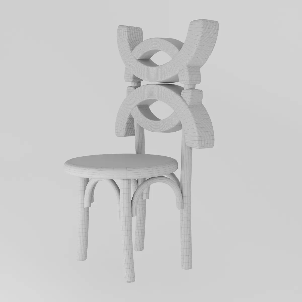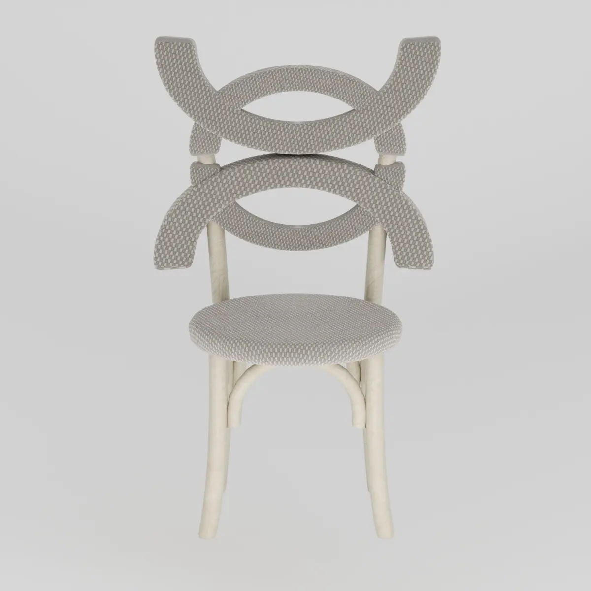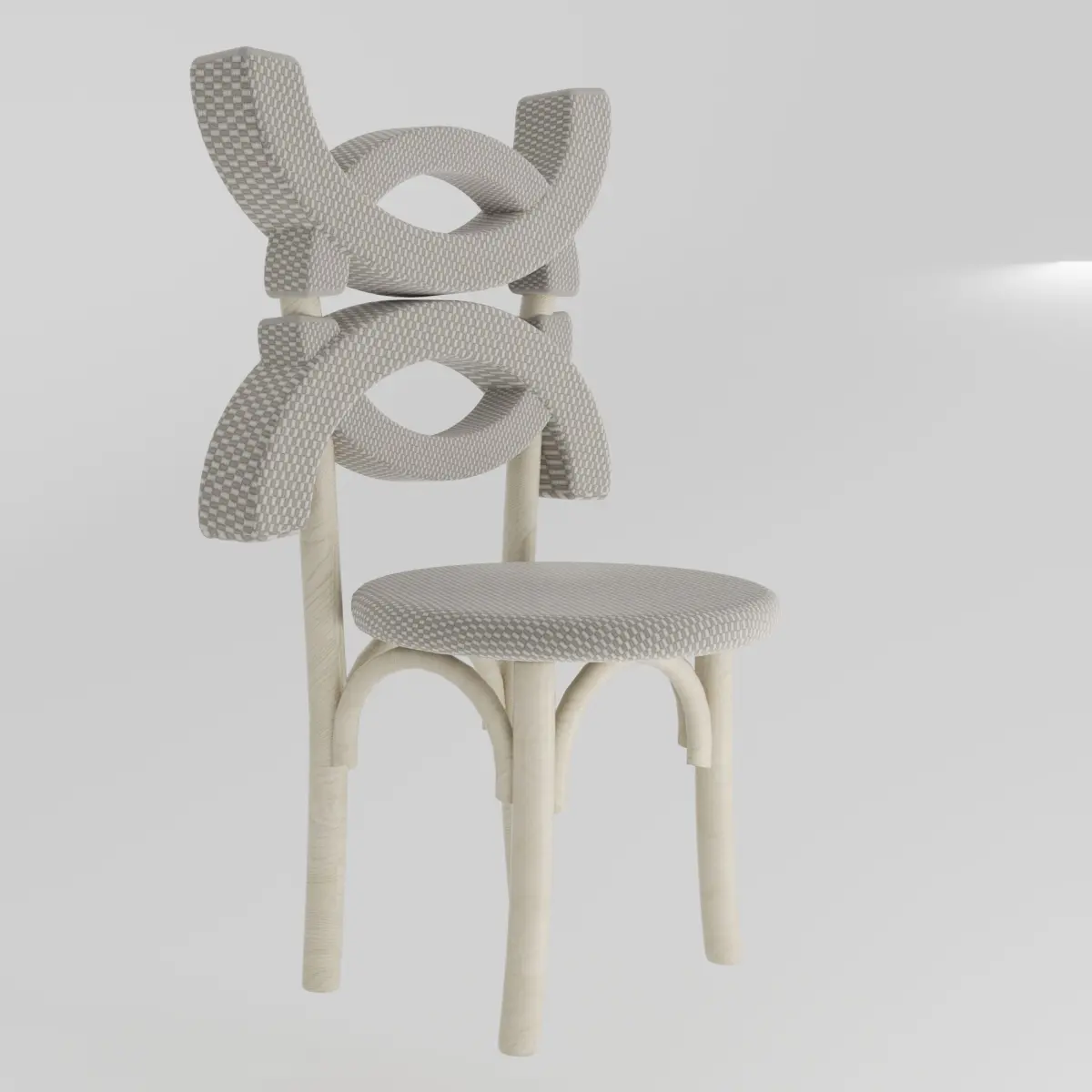 Description of the chair: Backrest: Consists of two decorative intertwined elements that resemble geometric loops in the form of rings and arcs. It is covered with a soft fabric with a relief, checkerboard pattern in light beige colors. The design visually resembles a modern art object rather than a classic chair back. Seat: Round, soft, upholstered in the same textured fabric.The pattern of the fabric on the seat is in harmony with the backrest, creating a complete composition.Legs and frame: Made of light wood or wood-like material with a natural texture.There are curved arched elements under the seat, which make the structure light and decorative.