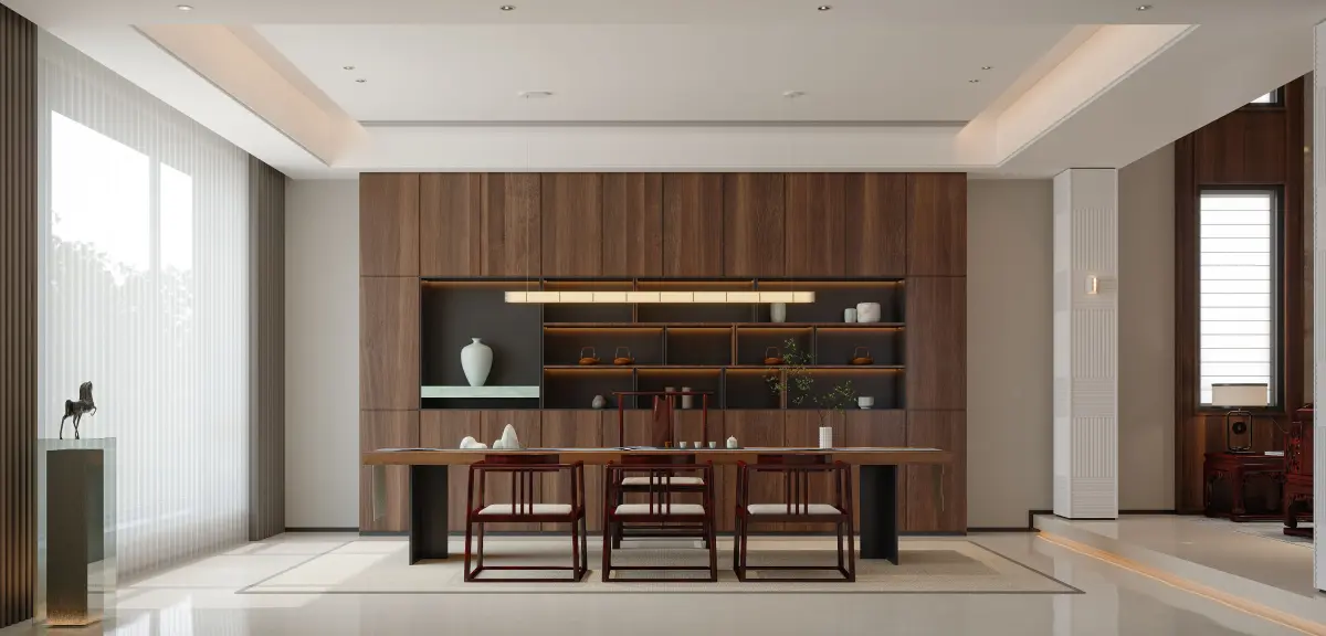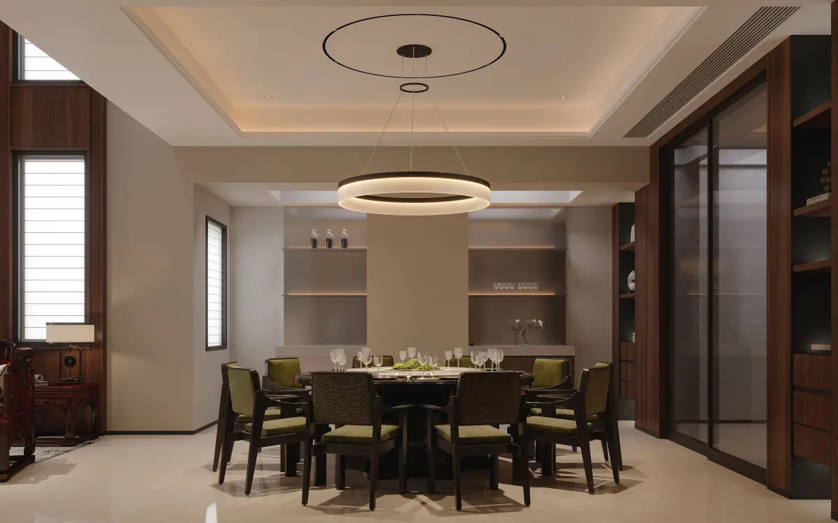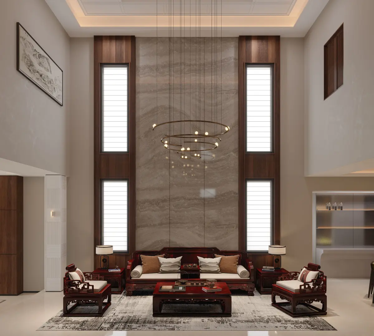 This 3D model presents a modern Chinese style villa living room with a stunning double height ceiling design. The space blends traditional Chinese aesthetics with contemporary elegance. It features large windows wooden elements elegant furnishings a central chandelier and decorative screens capturing the essence of refined new Chinese interior design. Perfect for architectural visualization design presentations and virtual staging.