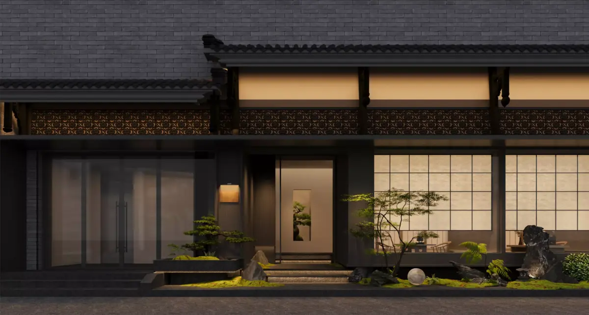 The space strongly embodies a modern interpretation of Eastern aesthetics, particularly Japanese elements (such as tatami mats and shoji screens) and Chinese elements (such as courtyard landscapes and carved wooden screens). The overall effect is a tranquil, minimalist, composed, and Zen-like atmosphere.