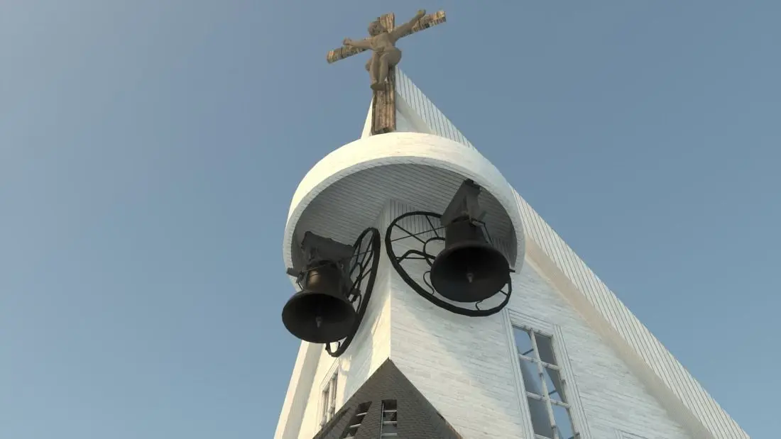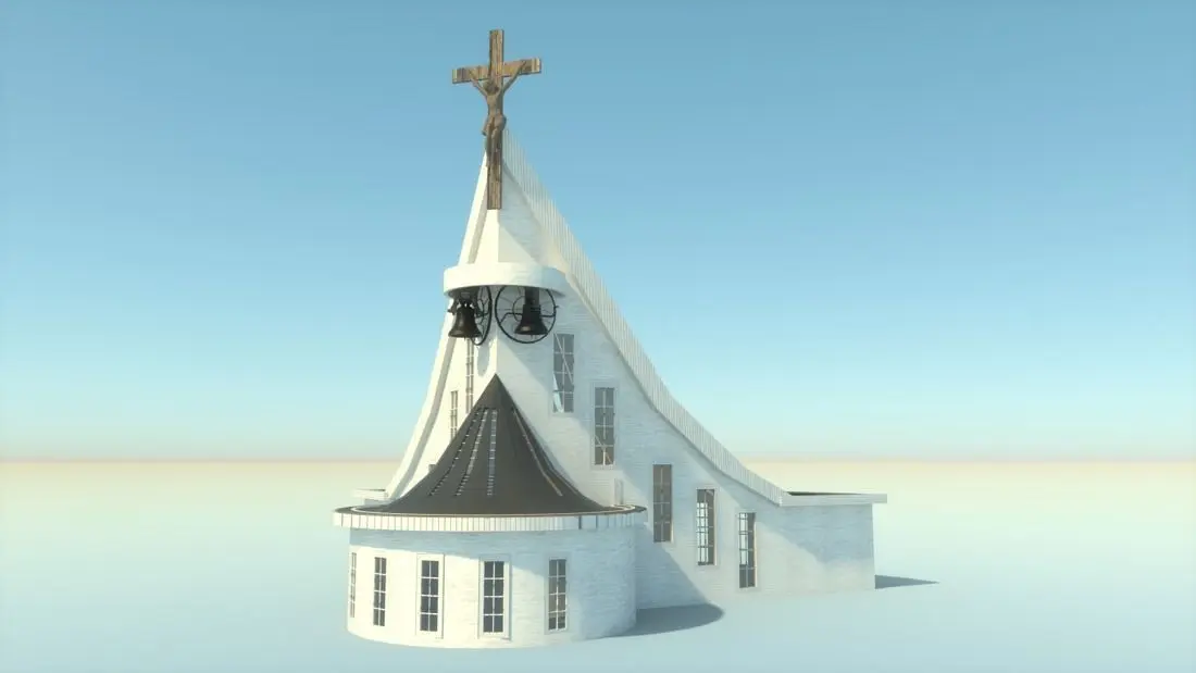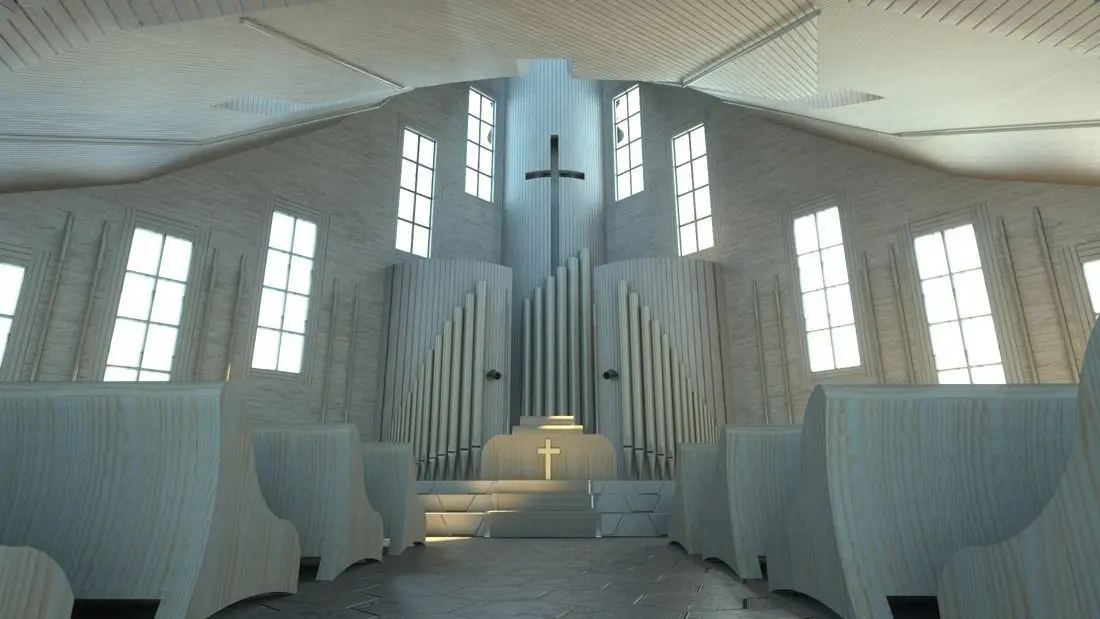 Fictive modern exterior and interior of the church.
