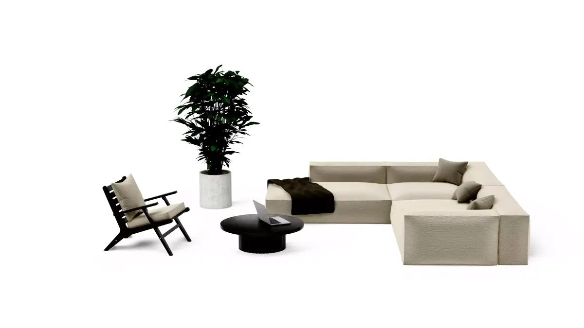 At the center stands a sleek black wood coffee table paired with a matching chair — a perfect spot for a laptop or decor accessories. A tall indoor plant brings a touch of organic balance to the arrangement, enhancing the visual harmony between form and function.