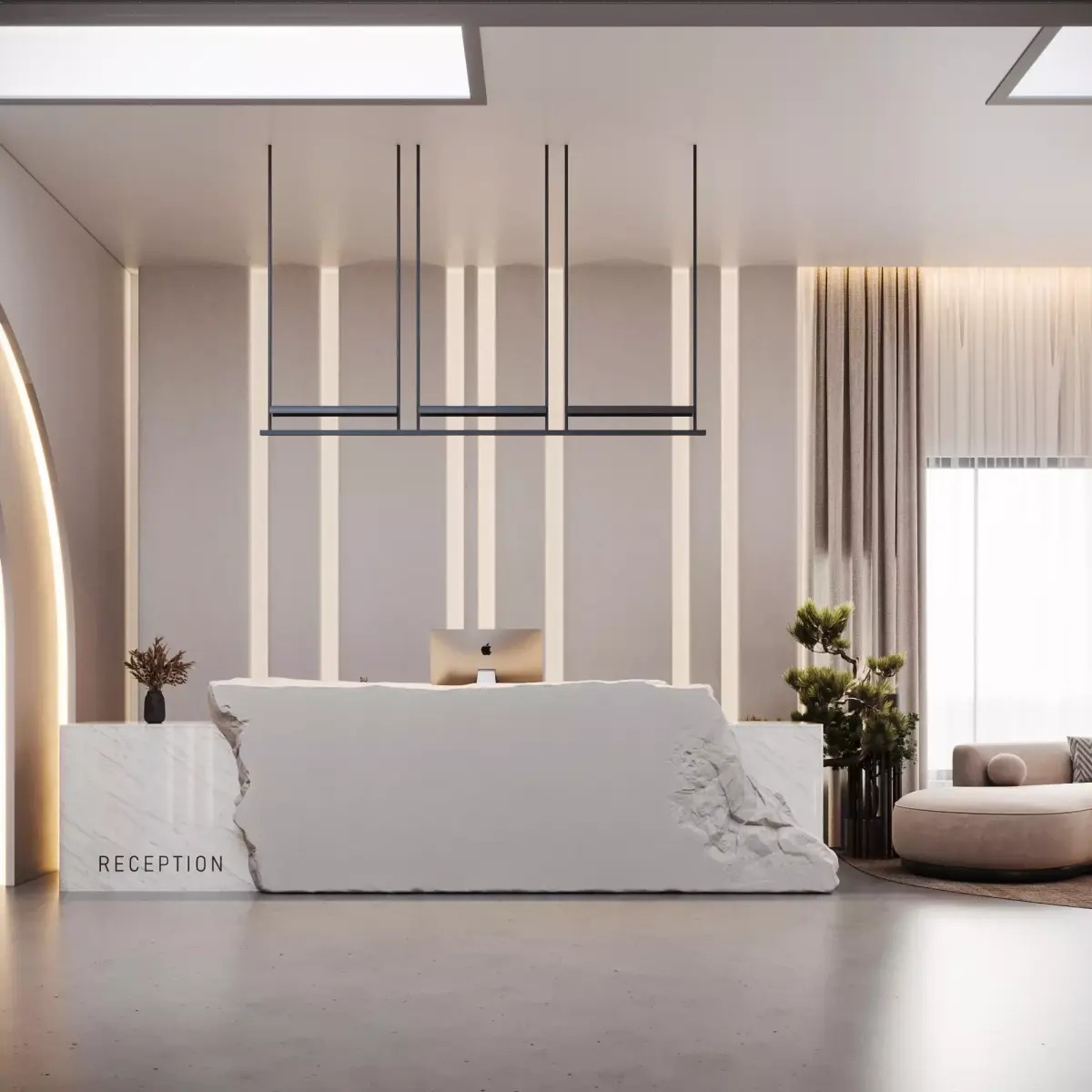 Realistic reception desk and waiting area design