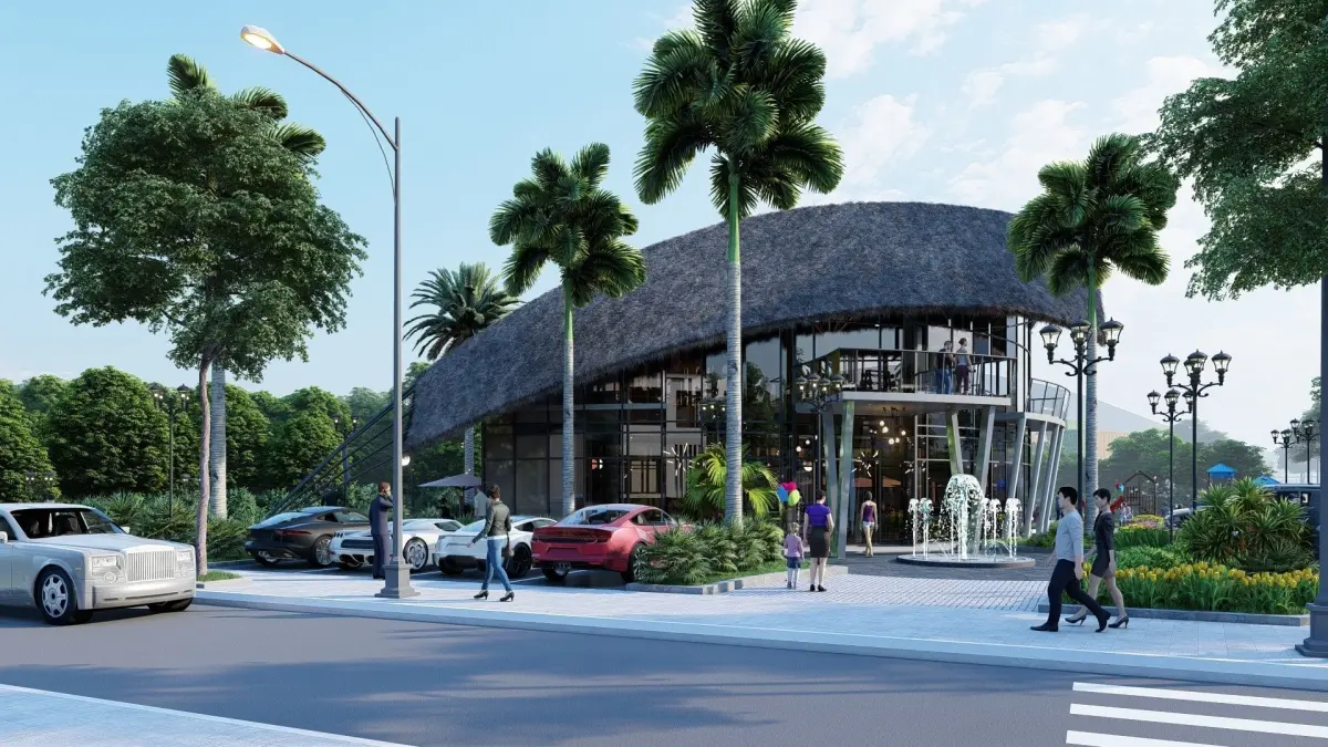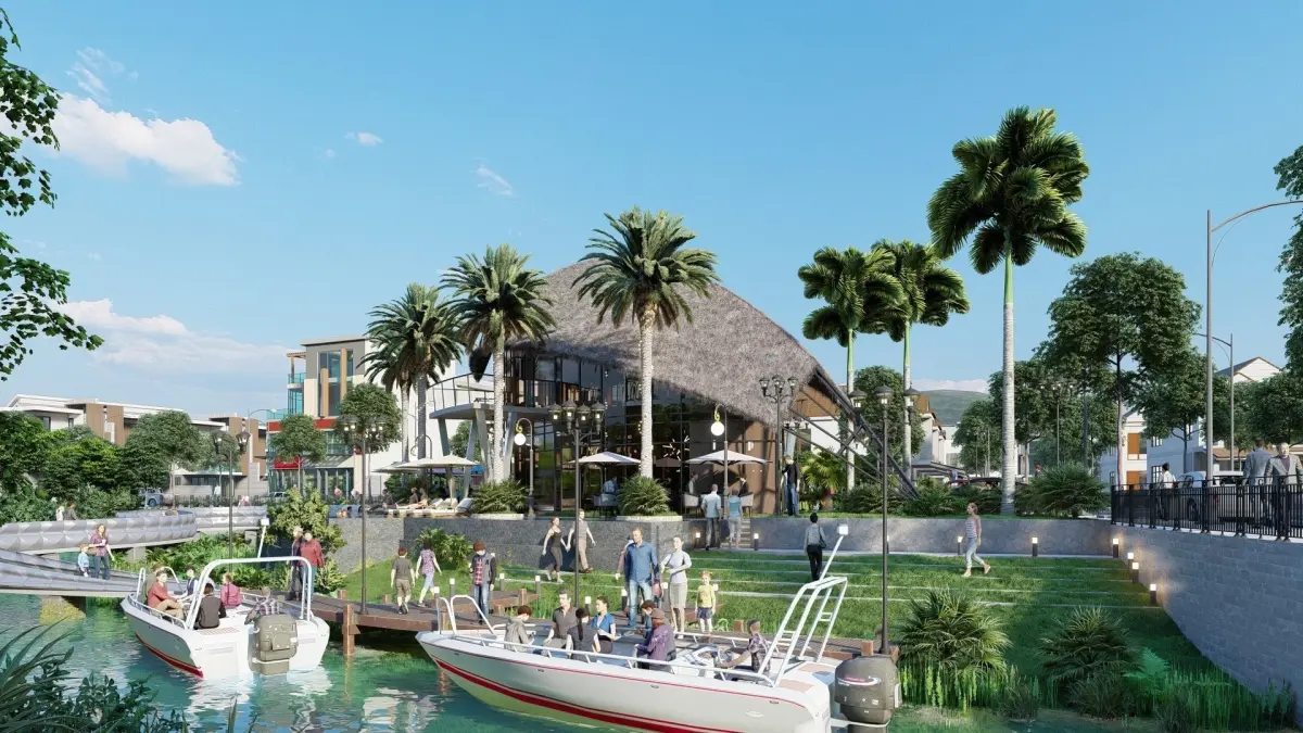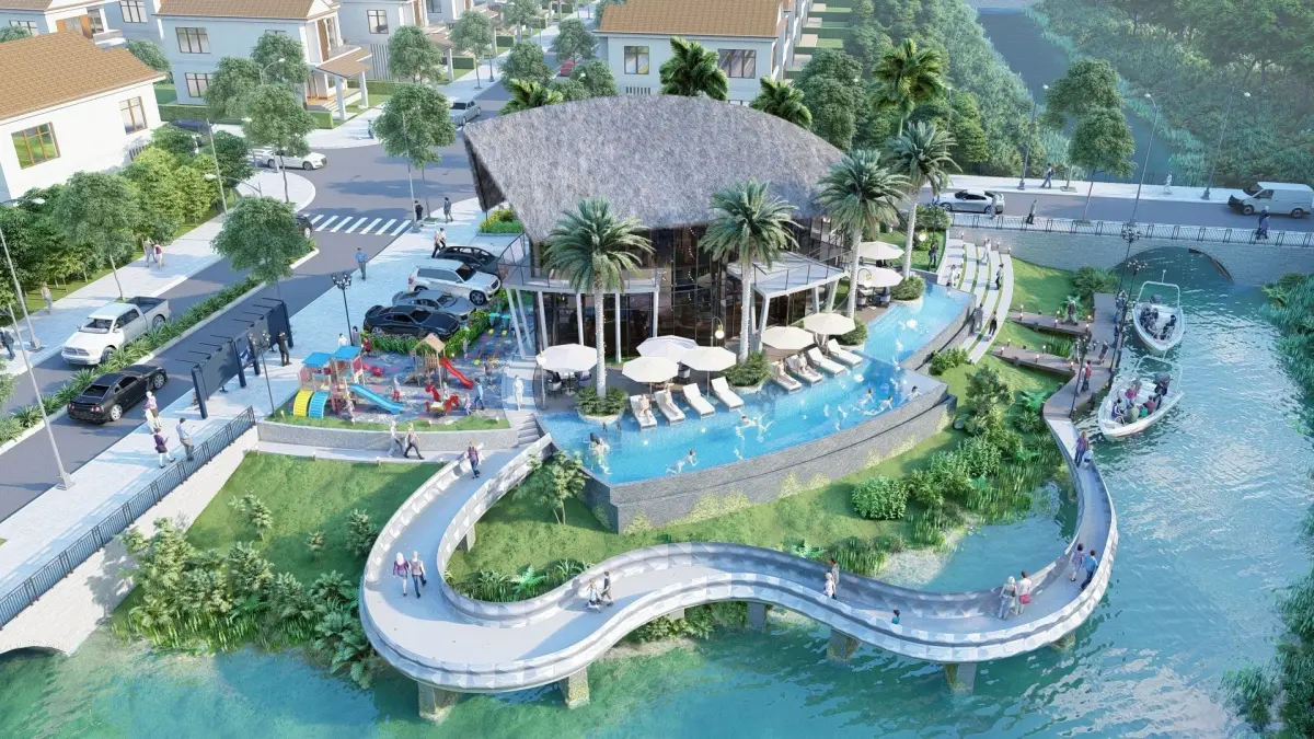 Modern club house design featuring swimming pool, canoes dock, kids' playground and water walkway for residences in the corner of the streets.