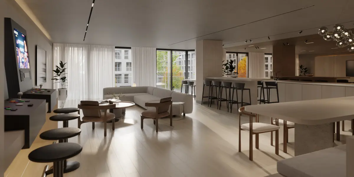 A fully detailed 3D scene of a modern clubhouse interior featuring: