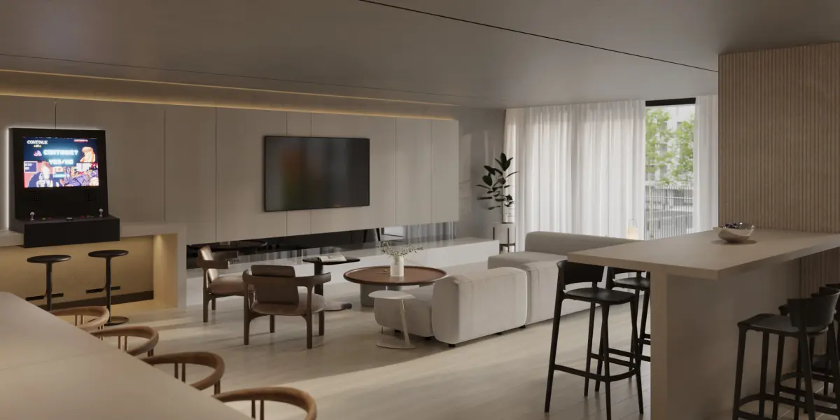 Carefully composed layout and materialsThe party lounge area is also styled similarly to a modern living room, featuring cozy furniture, ambient lighting, and an open layout suitable for both entertainment and relaxation – making it versatile for projects requiring realistic living space visualizations.
