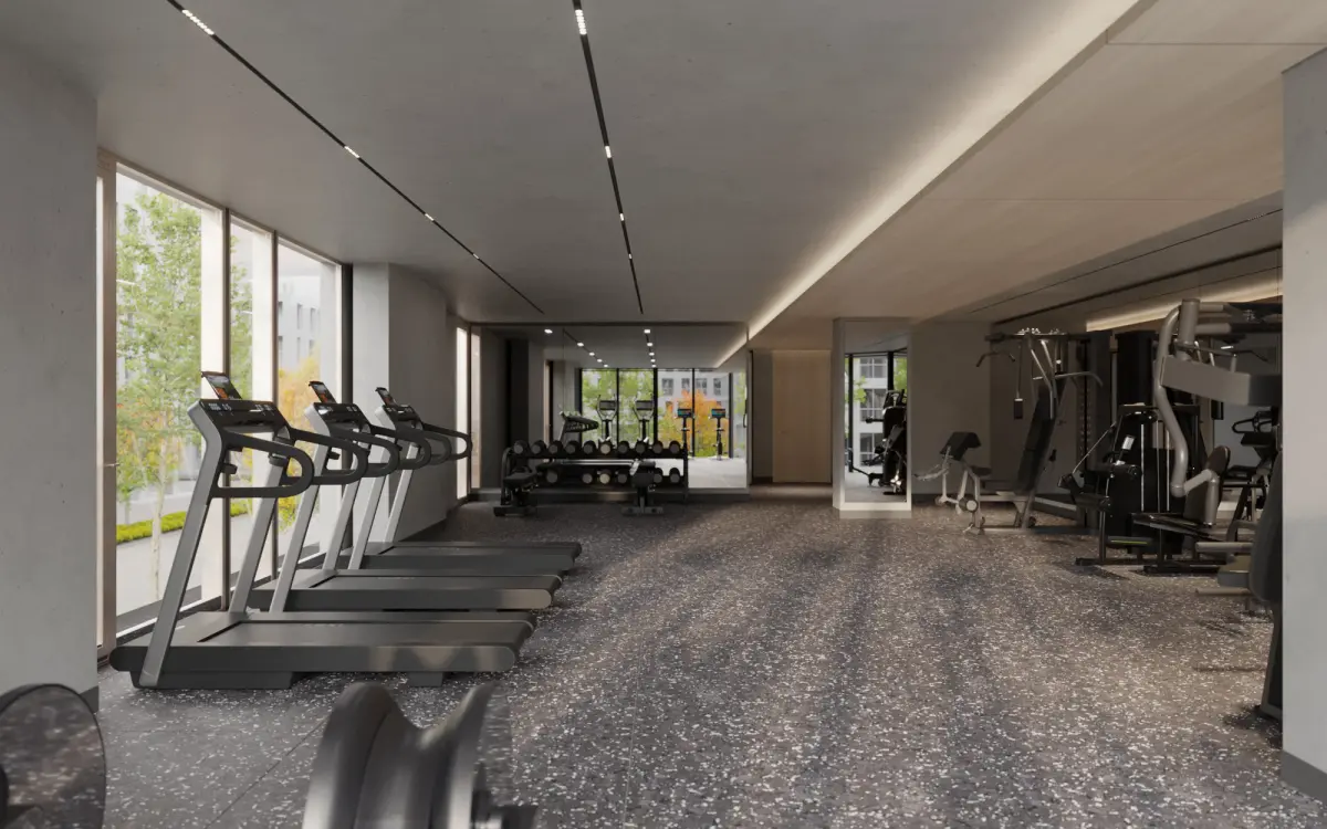 A fully equipped gym with treadmills, weight machines, and fitness gear