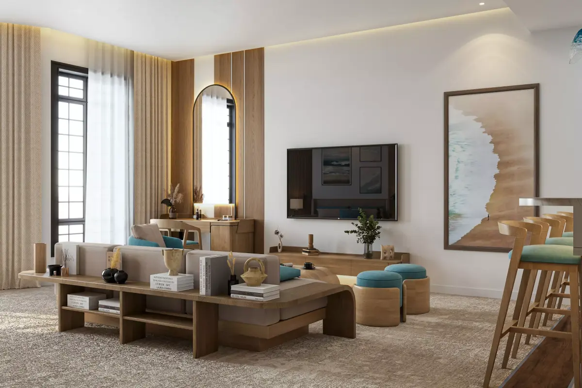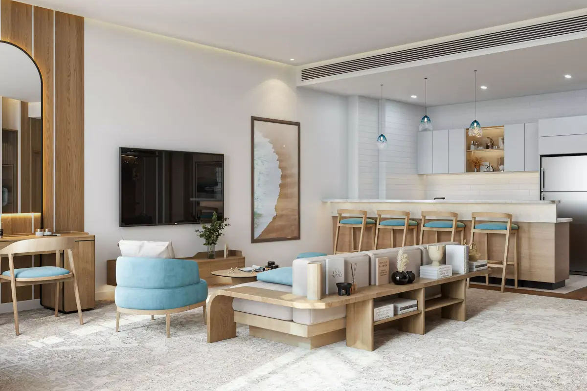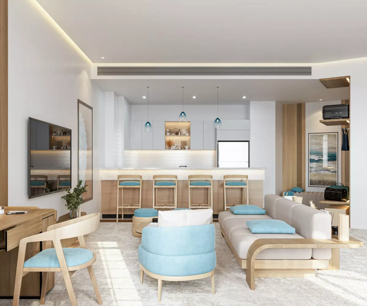 Professional Modern Coastal Studio Apartment InteriorLuxury Hotel Suite Interior with Kitchenette - 3ds Max CoronaMinimalist Wood & Turquoise Living and Bedroom Design