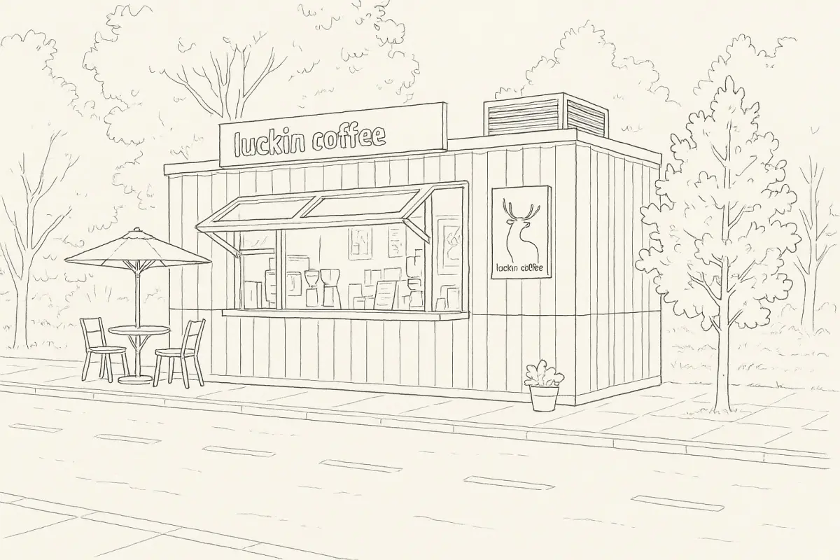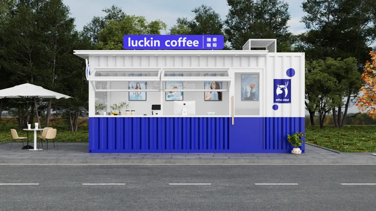 Inspired by modular container architecture, this design merges functionality and style, using the recognizable blue and white palette of the Luckin Coffee brand. It features a sleek takeaway window system, modern awnings, branded signage, and interior elements like posters, POS system, and bar layout — all reflecting a contemporary and efficient commercial café setup.