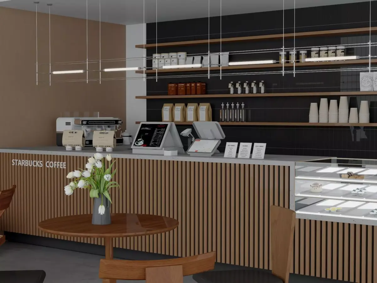 This 3D interior model of a modern coffee shop showcases the layout of a modern coffee shop, including the counter, menu board, display shelves, coffee machine, tables and chairs, lighting, and decorative plants. The design emphasizes clean lines, warm wood materials, and a realistic commercial atmosphere, suitable for concepts such as coffee shops, cafes, or restaurants. The model has a clear structure and is optimized for rendering, making it suitable for both close-up shots and full interior views.