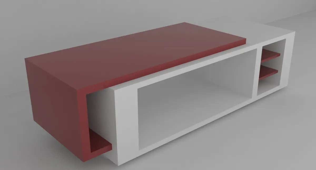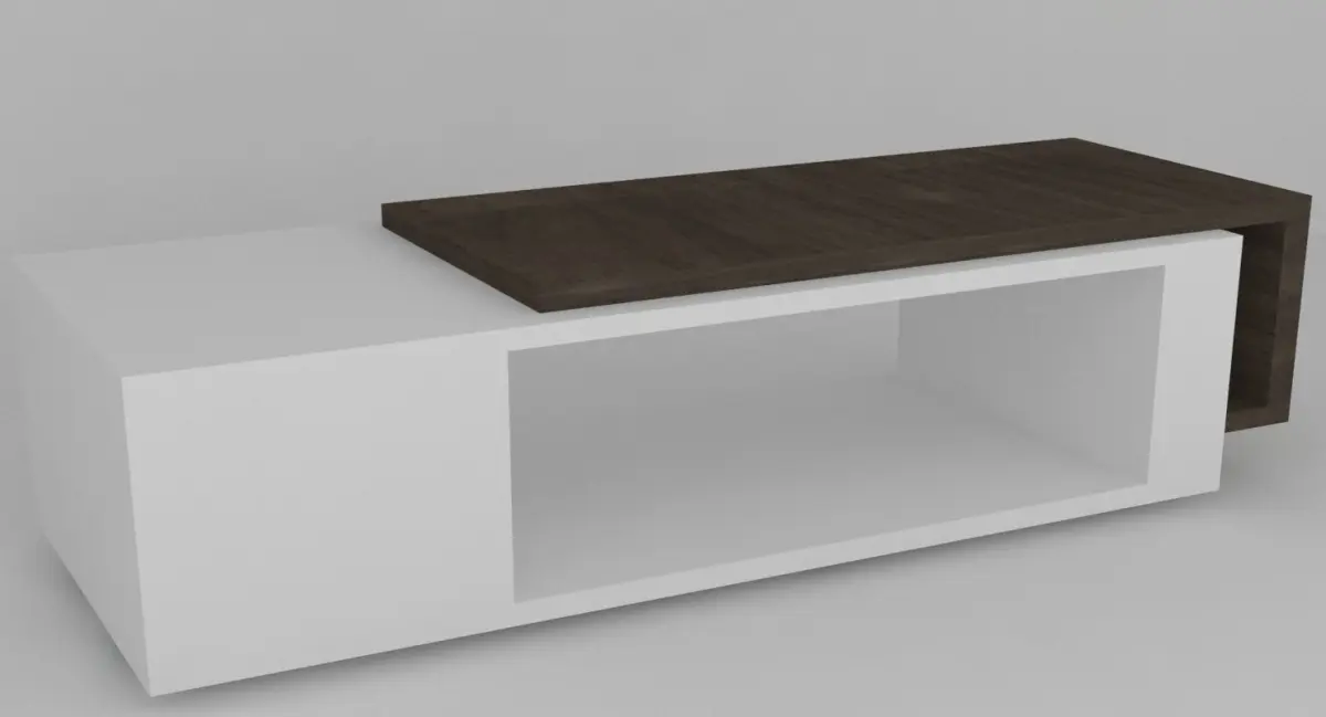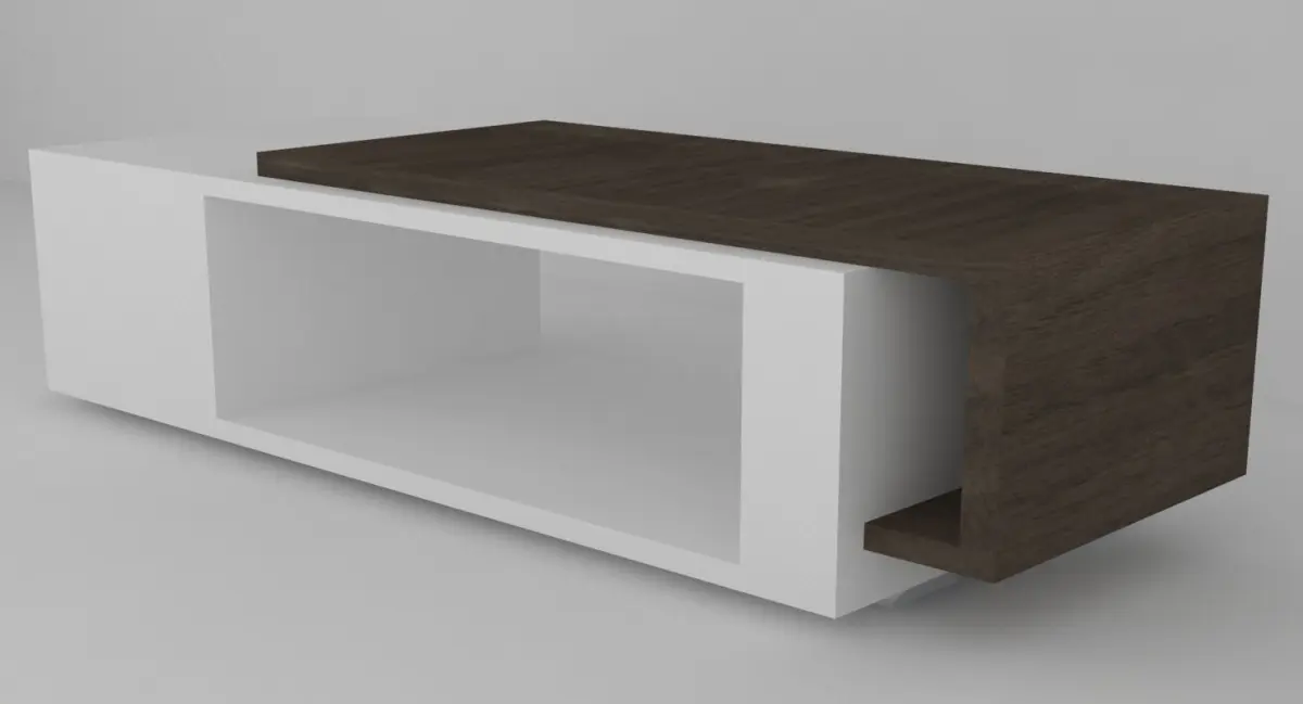 Inspired by clean lines and quality materials such as marble and hardwood, the modern style is refreshing and elegant and brightens up any living room. The design is also influenced by neoplastic principals and works of Mondrian in part. The table is made of two principal overlapping surfaces, one made of dark laquered wooden planks, the other in plain white colour. The accent,wooden, slab winds up to make an overhung small shelf on the left side. On the right side are two small shelves that seem to develop from the overhang on the left side and under the board is a large open space for storage or decor