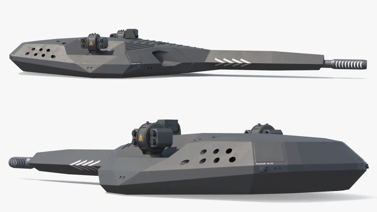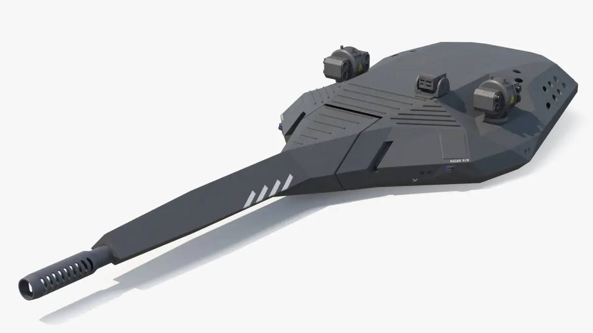 The model showcases a low-profile angular design with stealth features, reinforced plating, and a long-barreled main cannon. It incorporates high-tech sensors, radar modules, and targeting systems for precision combat. Its dark gray finish emphasizes modernity and stealth-oriented engineering.