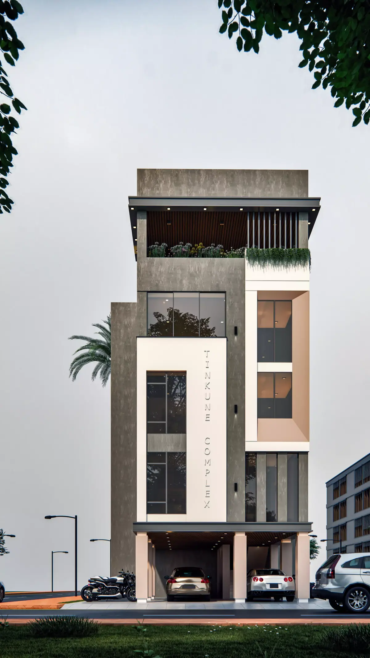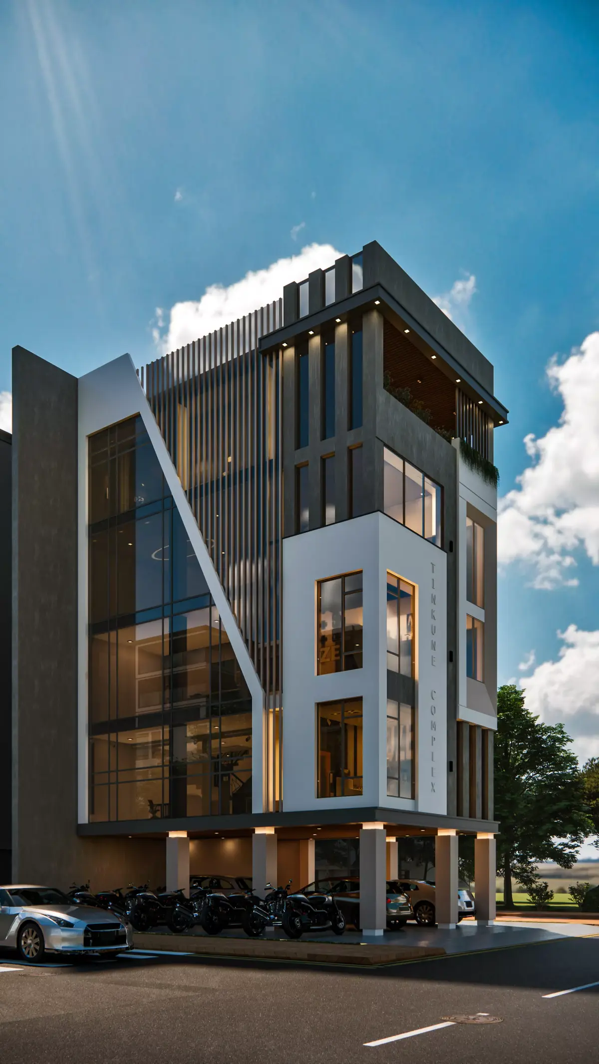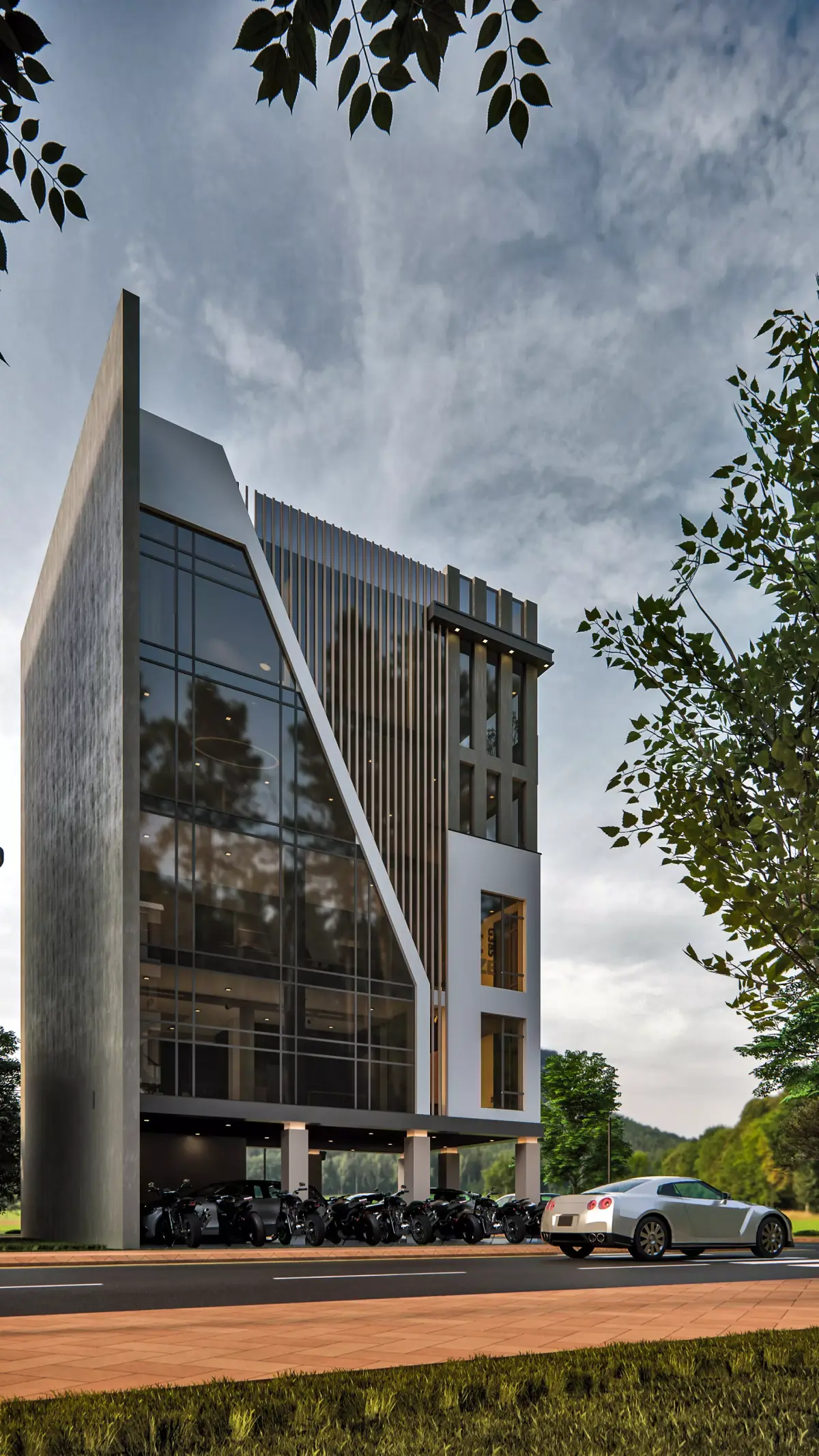 Present your architectural projects with confidence using this premium modern commercial building 3D model, designed with clean geometry and optimized for Enscape real-time rendering. This striking multi-storey structure is perfect for commercial proposals, mixed-use developments, visualization portfolios, and urban design concepts.This design features a bold contemporary aesthetic, blending sharp geometric lines, contrasting materials, and expansive glass façades that create a sleek professional look. Vertical fins, textured wall panels, and a double-height glass entry volume add architectural depth and realism. The upper floors incorporate floor-to-ceiling windows and a partially open terrace area, ideal for showcasing office, co-working, or retail use.At the ground level, the building includes an open parking canopy supported by clean structural columns, enhancing realism for city-based renderings. Exterior details such as vehicles, greenery, lighting, reflective glazing, and clean material transitions elevate your final presentations instantly.Why This Model Stands Out