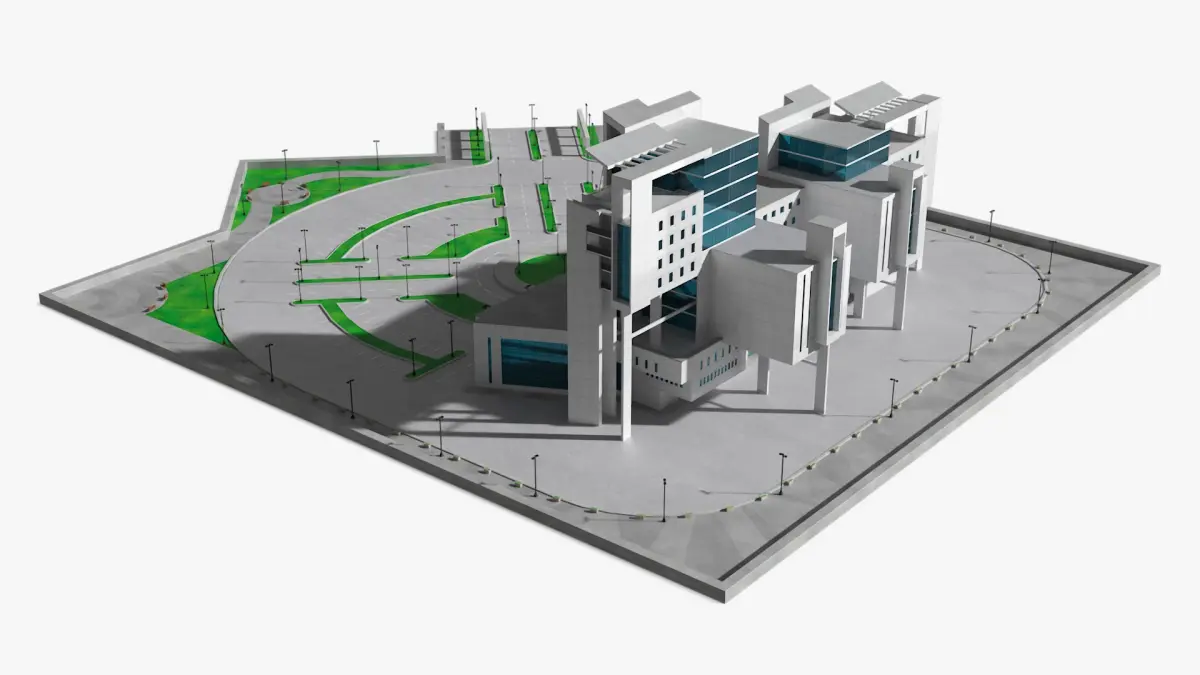 Modern Complex with Landscaping is a 3d model of a contemporary architectural development featuring integrated outdoor spaces, designed to balance functionality and aesthetic appeal.