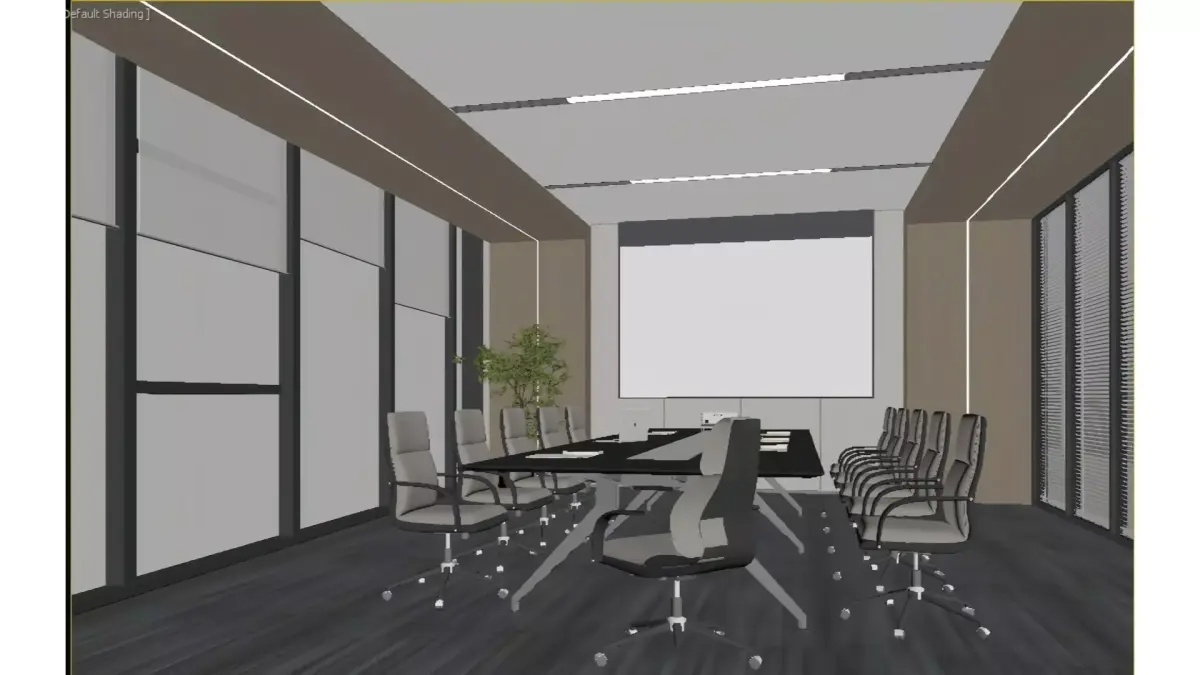This is a modern minimalist business meeting room, with the overall decoration focusing on a light luxury texture: light brown wood veneer is paired with glass partitions, and large floor-to-ceiling windows let in ample natural light while offering a bird's-eye view of the urban landscape. The long conference table is matched with comfortable office chairs, and the recessed ceiling lighting combined with linear lights creates a concise and professional atmosphere. Ideal for office scenarios such as business negotiations and team meetings, it boasts both practicality and visual appeal.