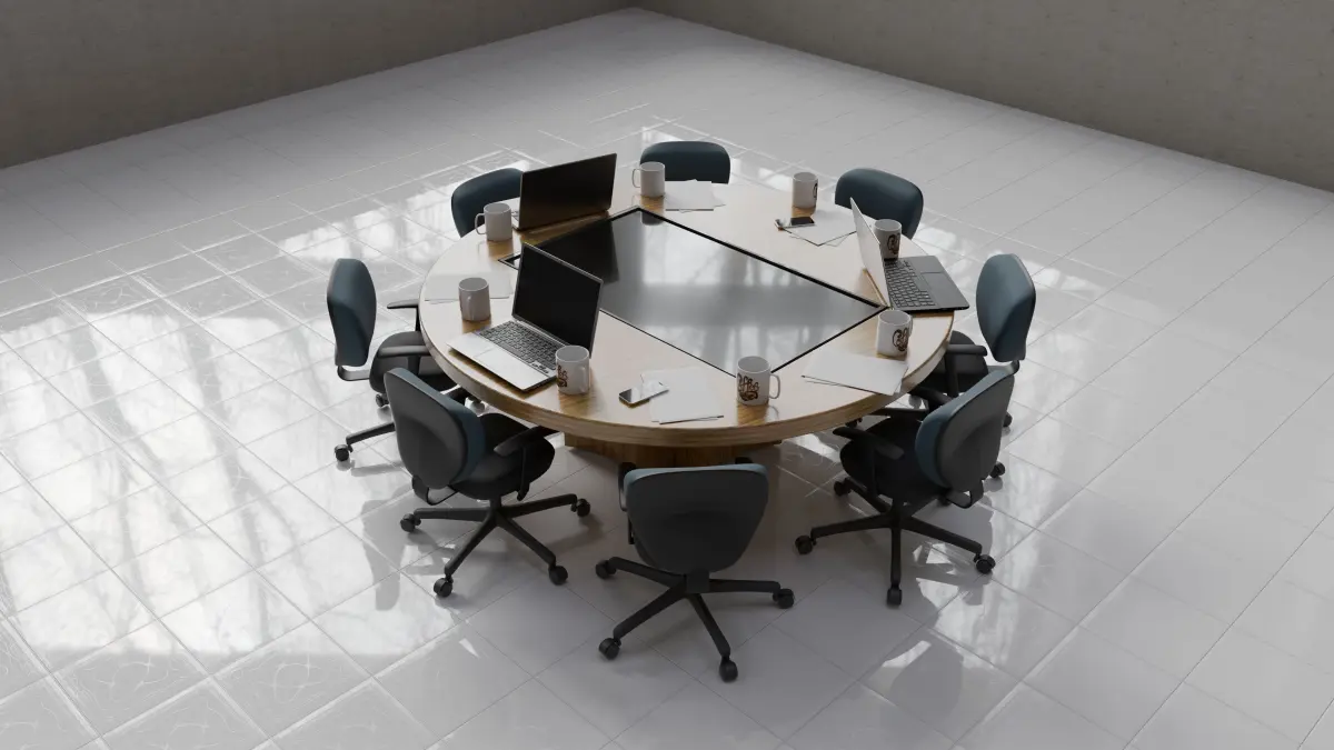 A complete 3D office meeting setup featuring a modern round conference table, ergonomic rolling chairs, laptops, coffee mugs, papers, and smartphones arranged for a professional meeting environment. Perfect for architectural visualization, office interior renders, business-themed animations, or product showcases.