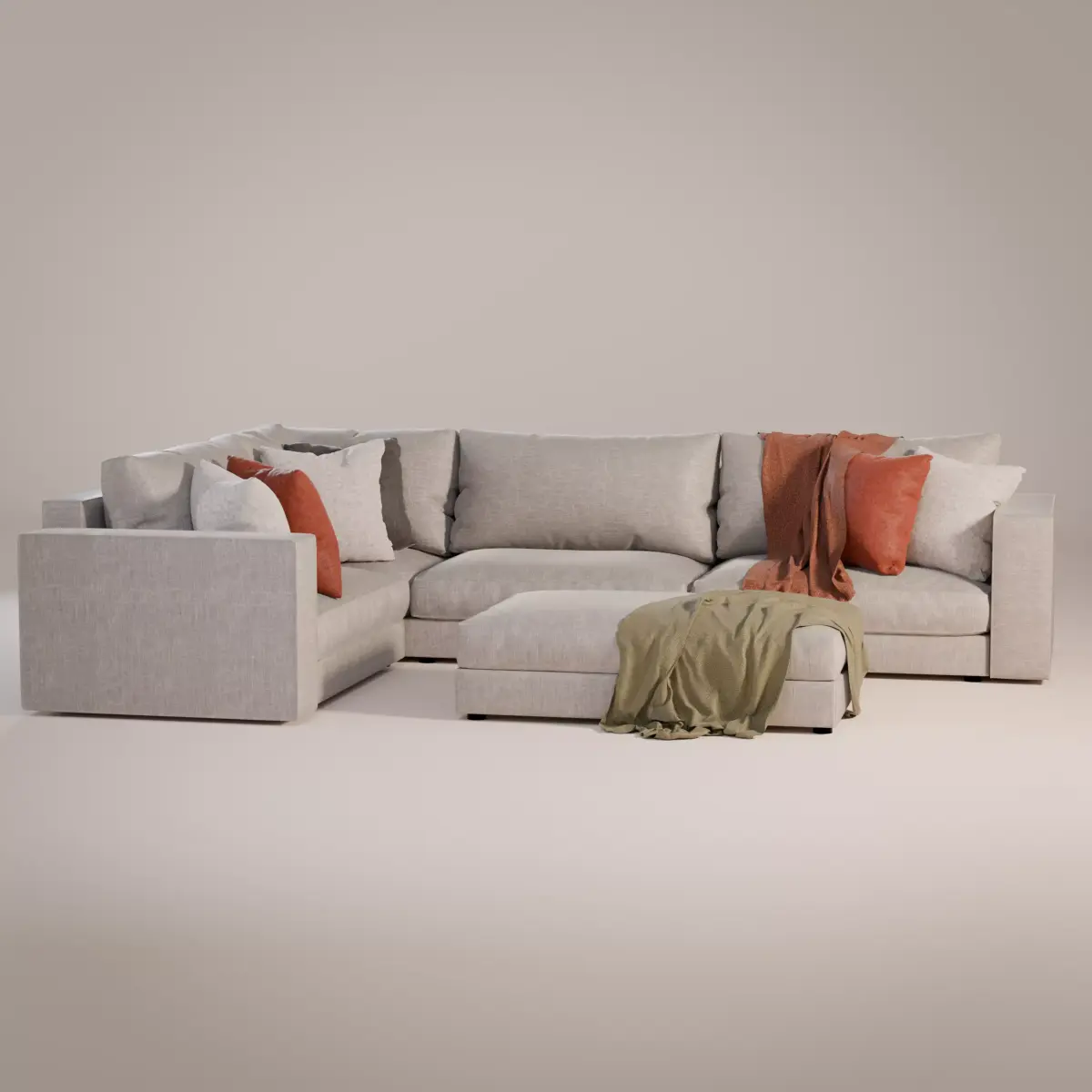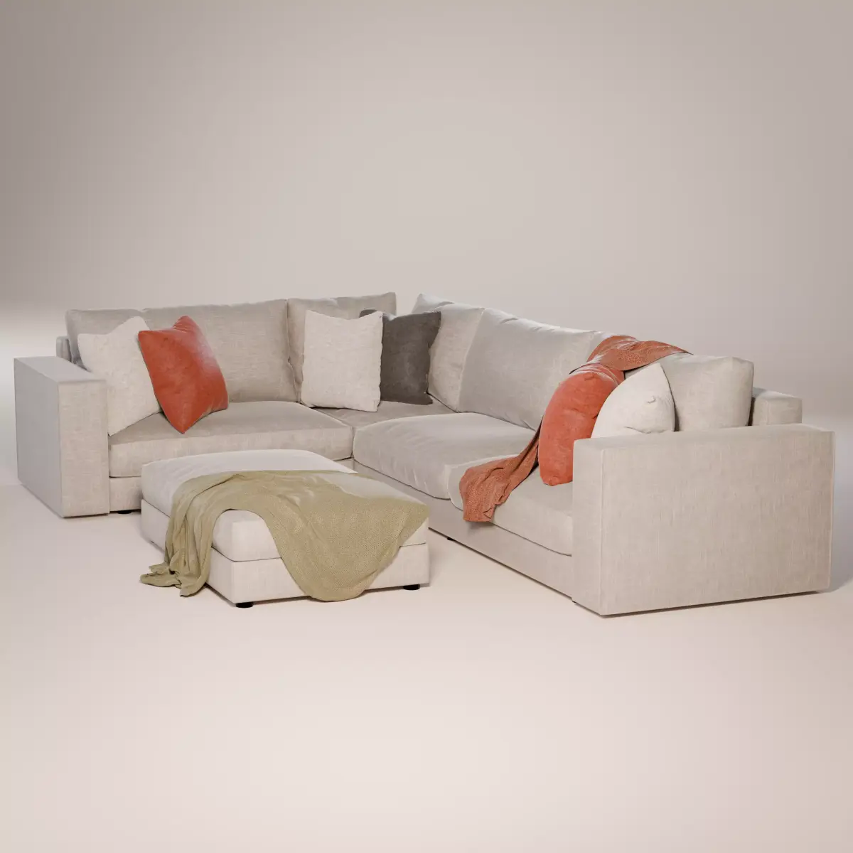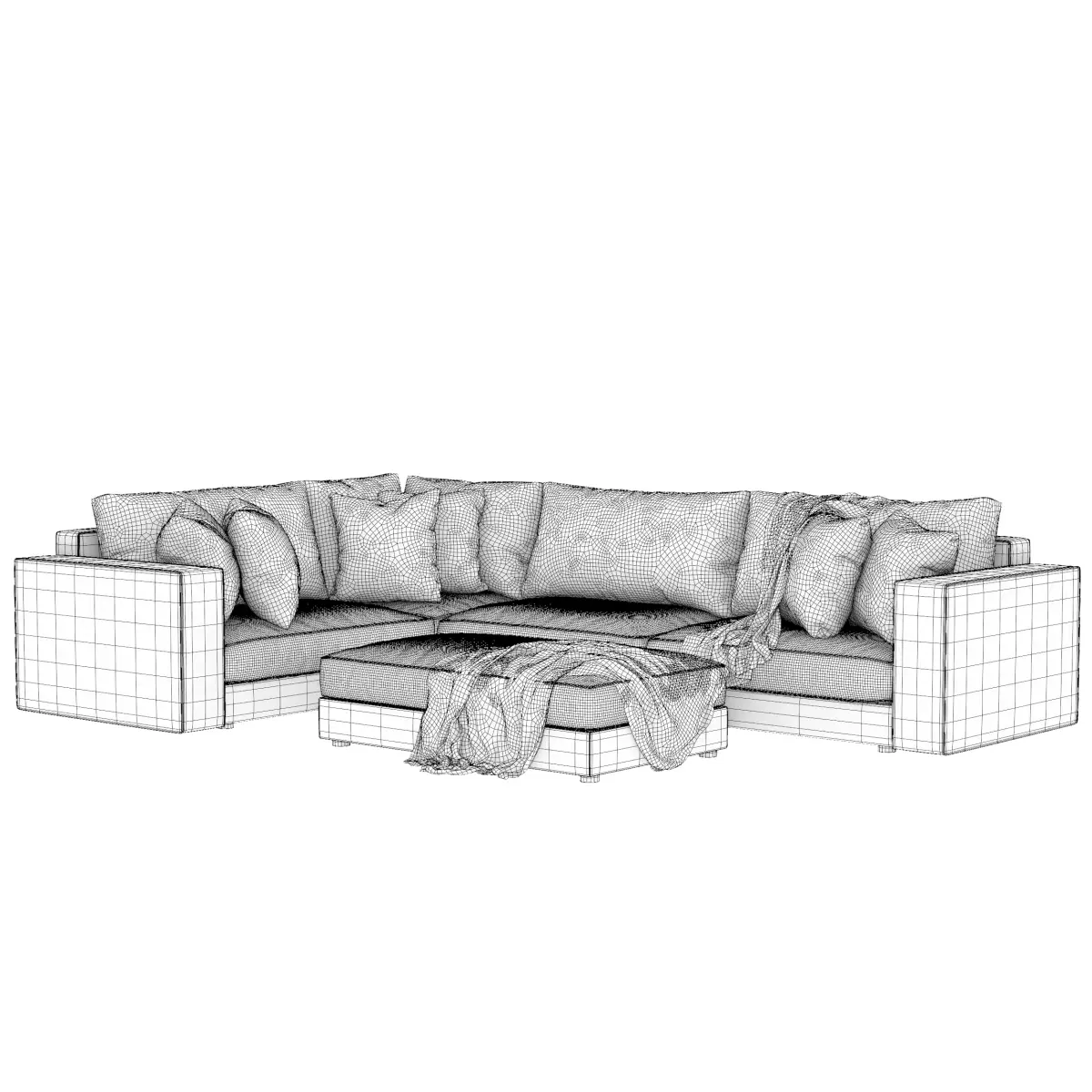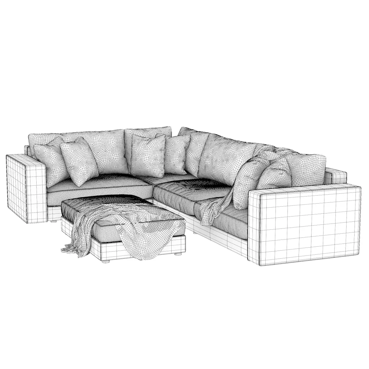 High quality detailed 3D model of a modern corner sofa with ottoman, created for interior visualization and close up renders. The model features soft fabric upholstery, realistic cushions, and decorative pillows with a throw blanket for a natural living room look. Clean geometry and accurate proportions provide reliable results in both studio lighting and full interior scenes.