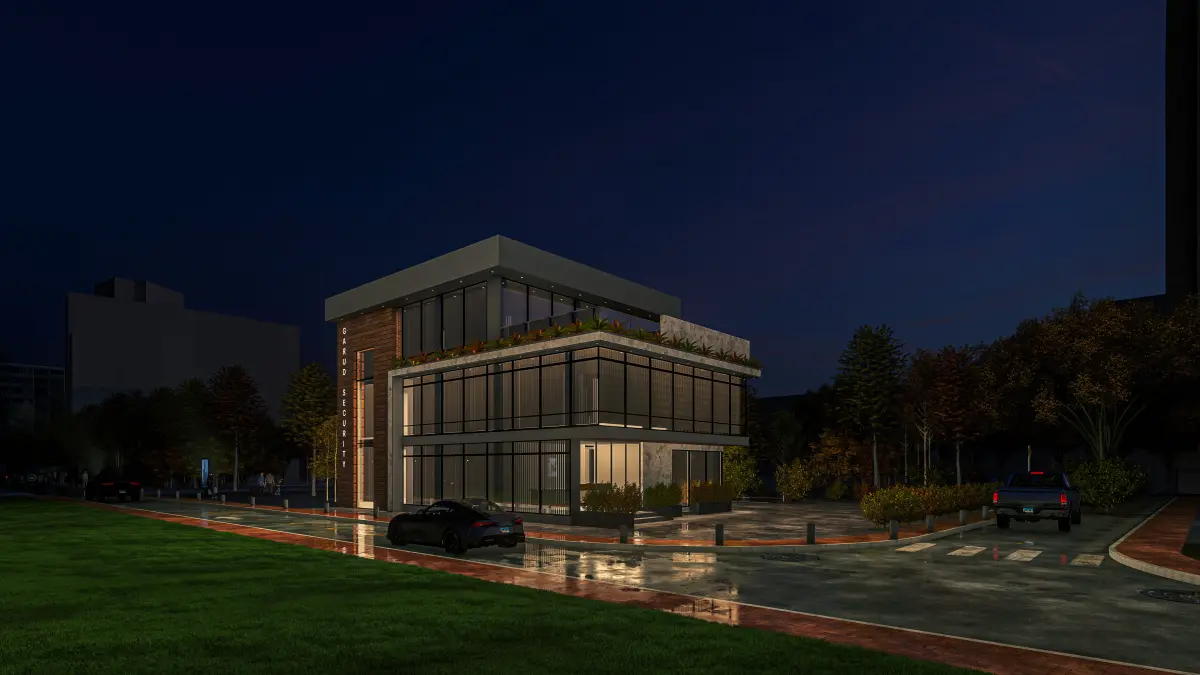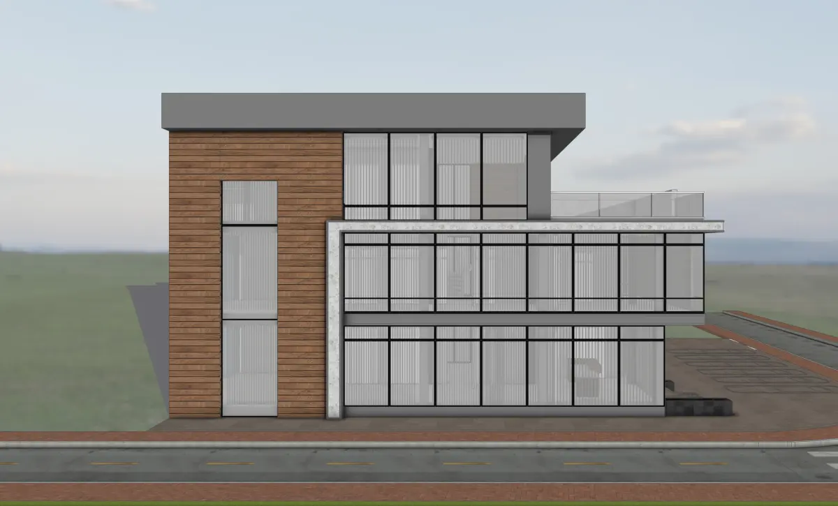 - Elegant Material Palette: A clean blend of vertical wood paneling, concrete textures, and aluminum framing enhances realism and architectural appeal.