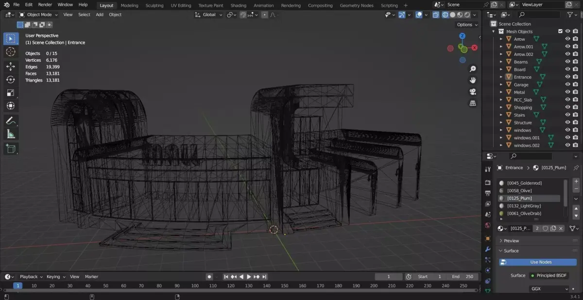 The building has a central main entrance that creates a strong visual focus. On the right side, three garage units are included, designed for vehicle parking. The entire structure follows a curved architectural style, giving the mall a modern and unique appearance. Exterior lights and sign boards are added to enhance realism and presentation quality. The model includes exterior design only, as visible in the preview images, and does not contain interior modeling.