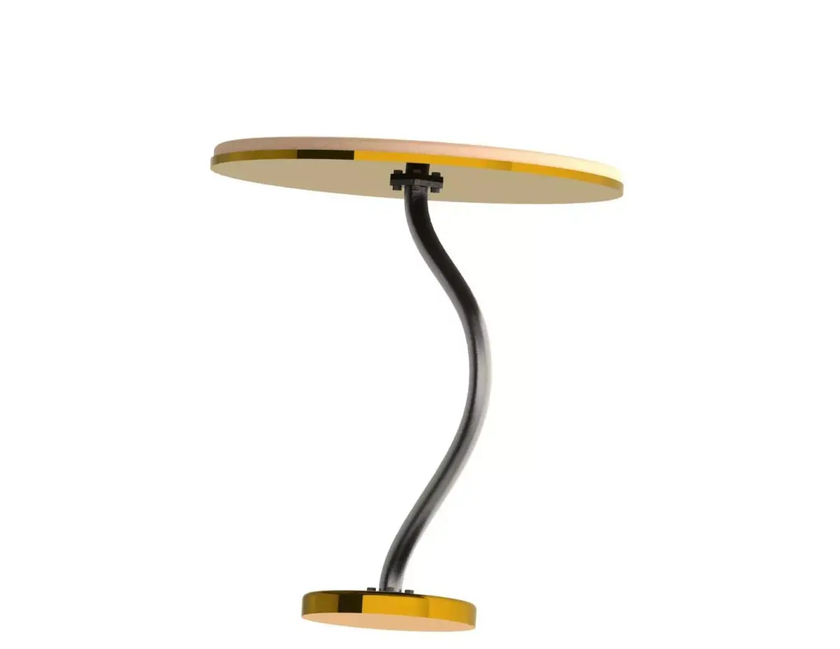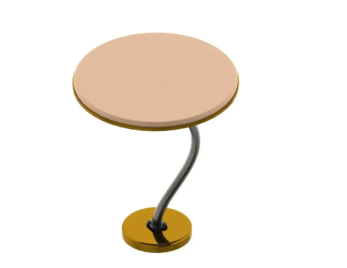A compact modern side table designed for everyday comfort and minimalist interiors. The table features a round wooden tabletop with a smooth, natural finish, supported by a single curved metal leg that flows organically into a circular weighted base. The elegant S-shaped support gives the table a light, sculptural appearance while ensuring stability. Its size and form make it ideal for placing next to an armchair or sofa, perfect for holding a cup of coffee, a book, or small personal items.