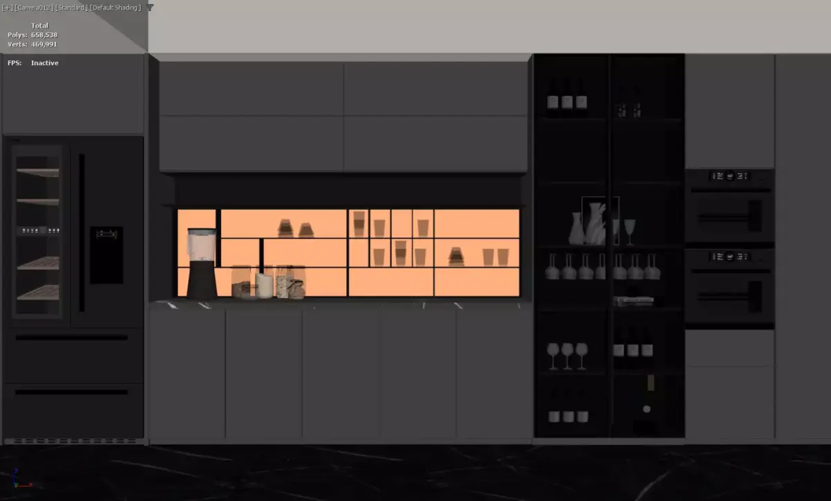 This modern kitchen features a unified dark-toned cabinetry design, integrated with:Functional zones: A beverage preparation counter (with small appliances), a built-in wine storage niche (glass-fronted, backlit), and embedded ovens.Design details: Ambient strip lighting (under cabinets, in niches) and a luminous backsplash, balancing sleek minimalism with practical storage.It suits contemporary luxury homes, merging culinary functionality with upscale beverage storage and atmospheric lighting.