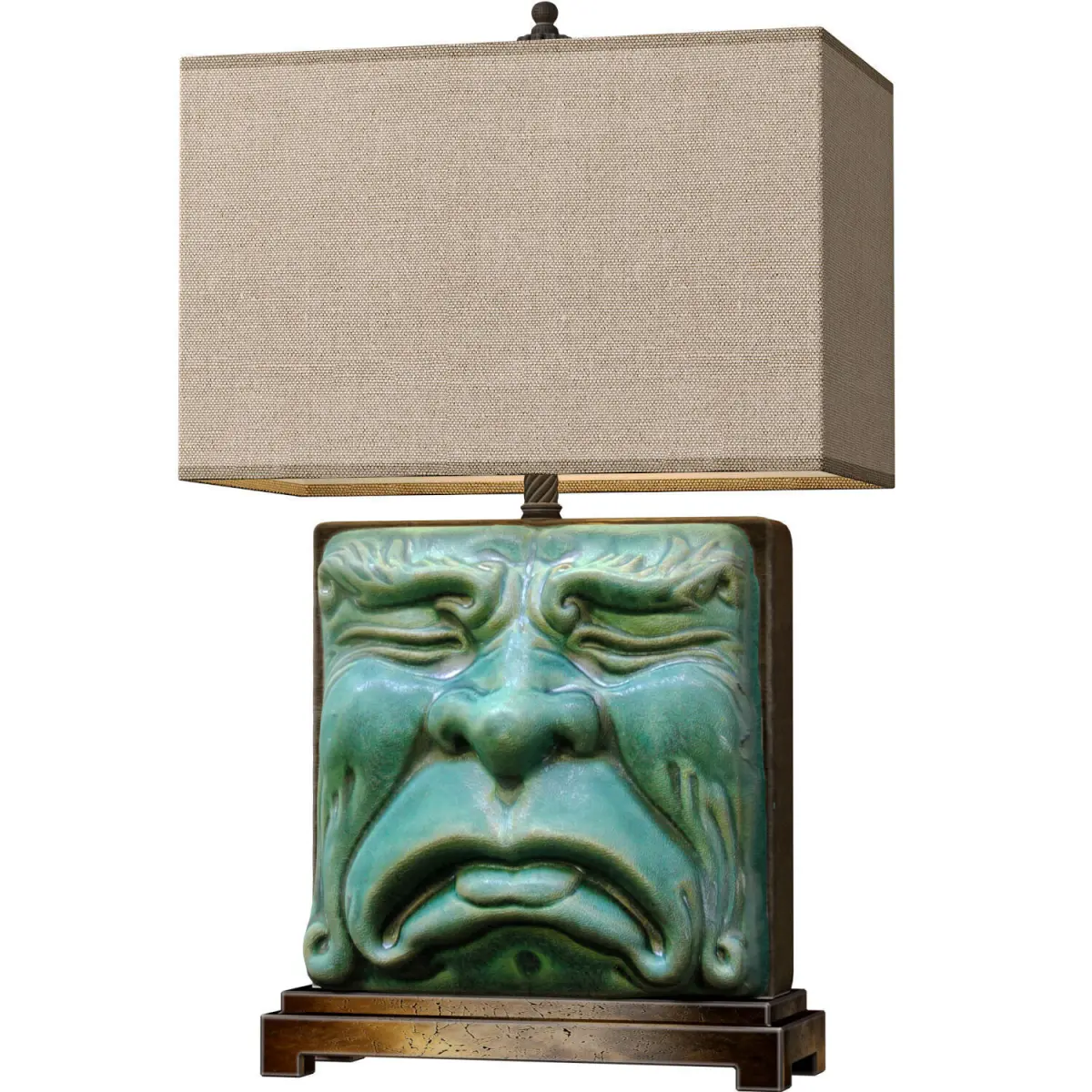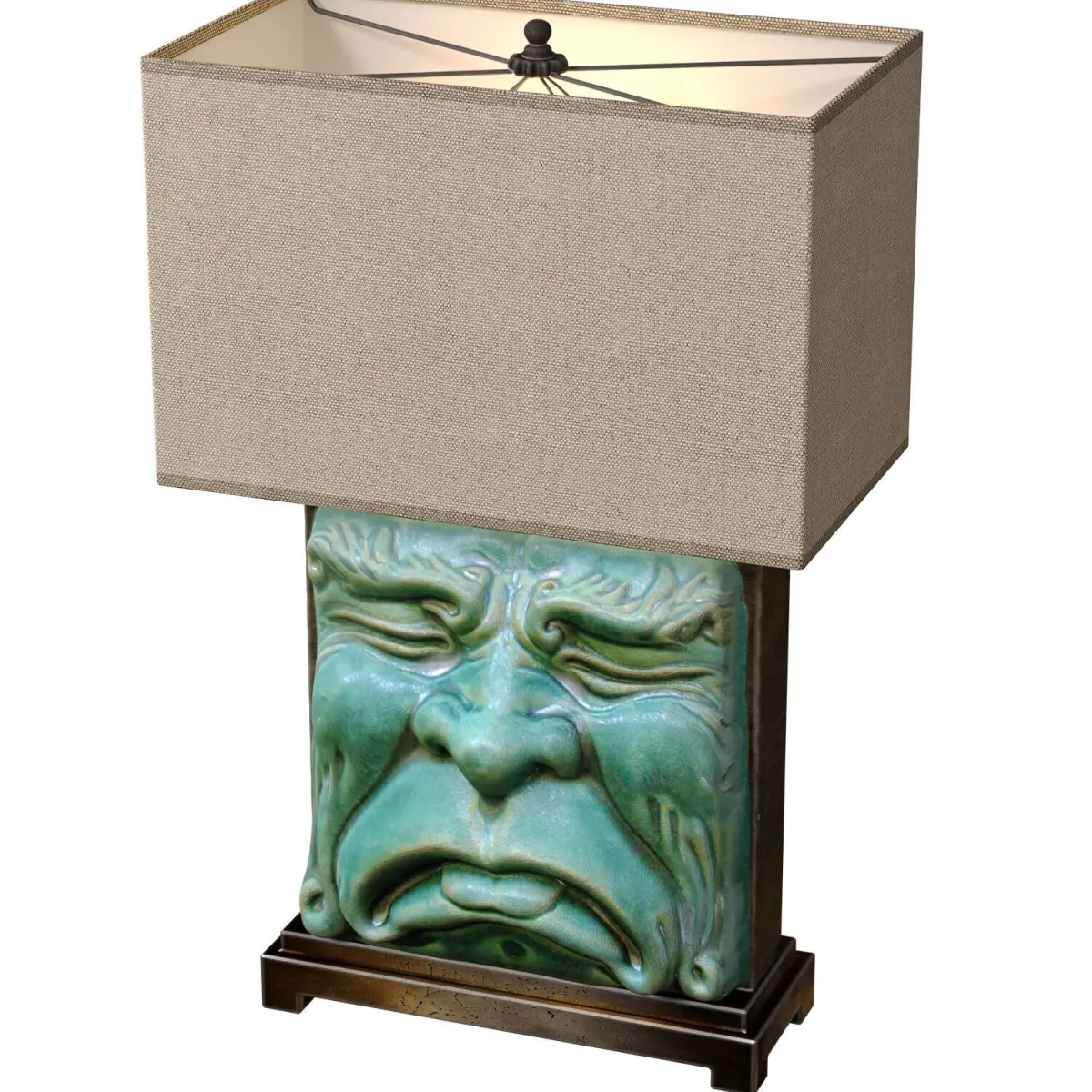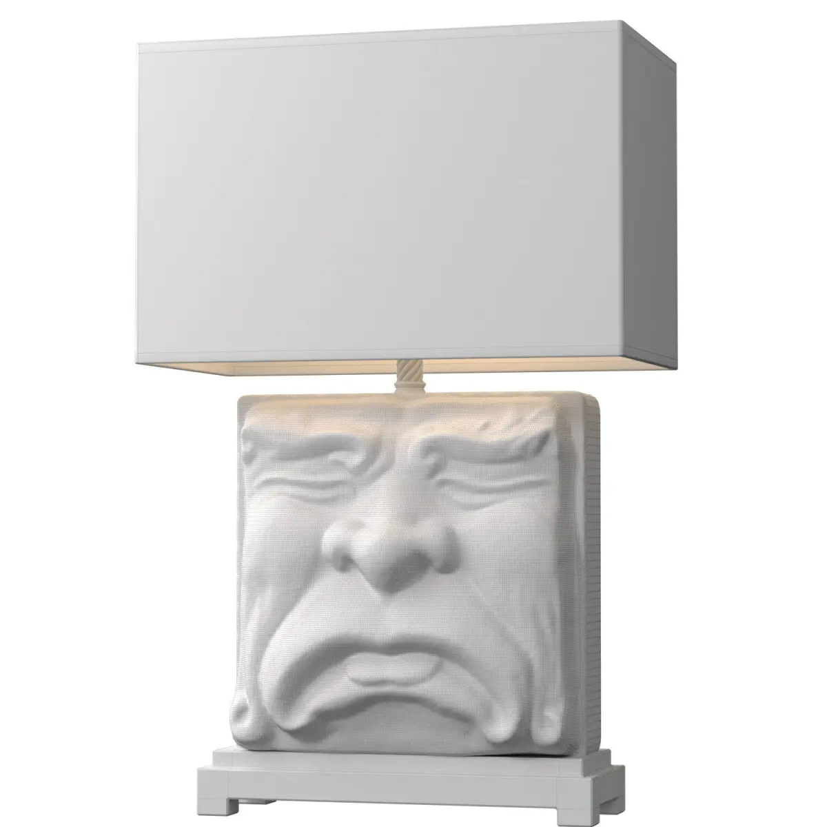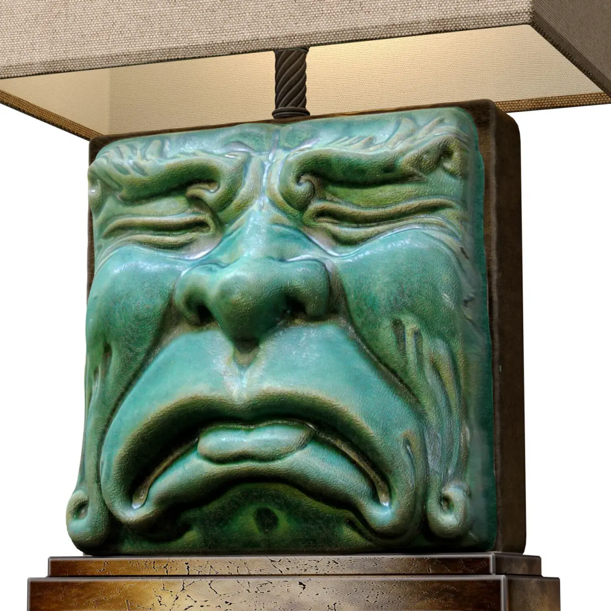 Decorative lamp with a base in the form of a comedy mask and a fabric shade for decorating the living room, office, study, bedroom, bedside table in a modern style.Ceramic Table Lamp Mask sculpture ,Western Lamps and Rustic Lighting,Desktop, designer, decorative, textured, embossed ,classic Modernist lampEuropean Art Nouveau Lamp for Home Decoration, Bedroom Lighting,