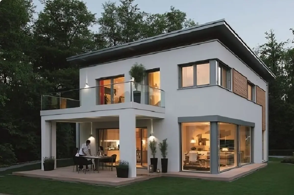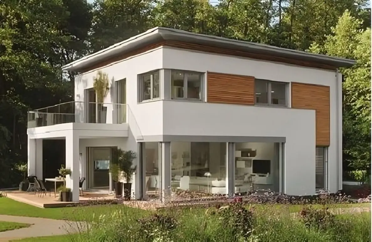 This contemporary double-story house, designed and visualized using SketchUp and rendered with Vray, boasts an open concept layout complemented by outdoor parking and lush landscaping.