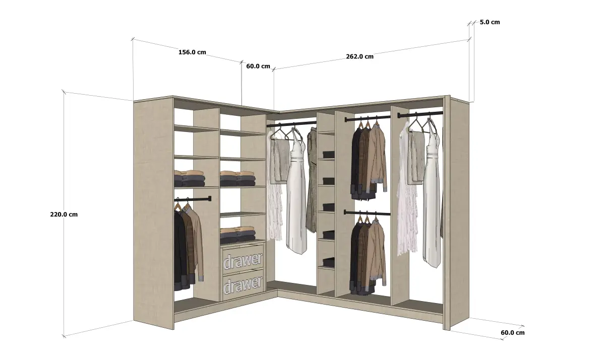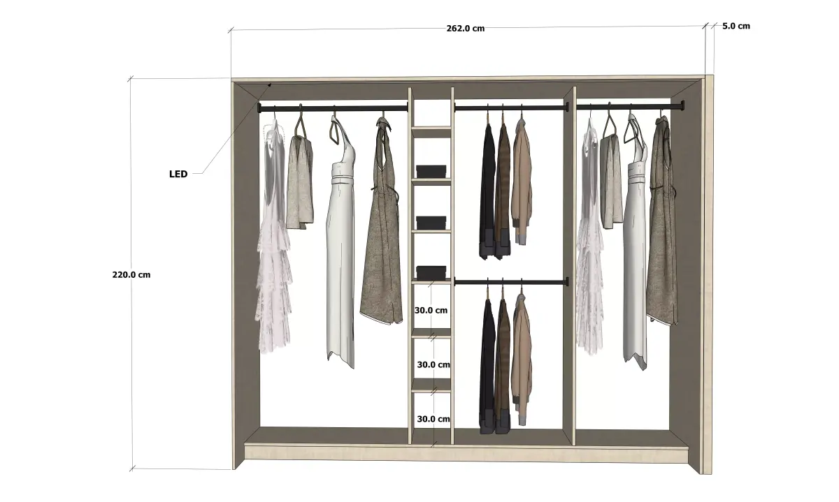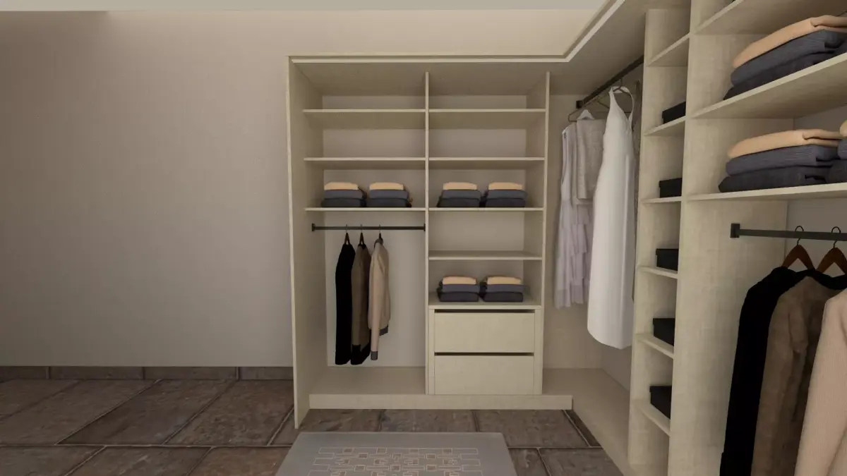 This is a conceptual 3D scene of a modern dressing room designed for comfort and immersive entertainment.includes closet and shoes cabinet .