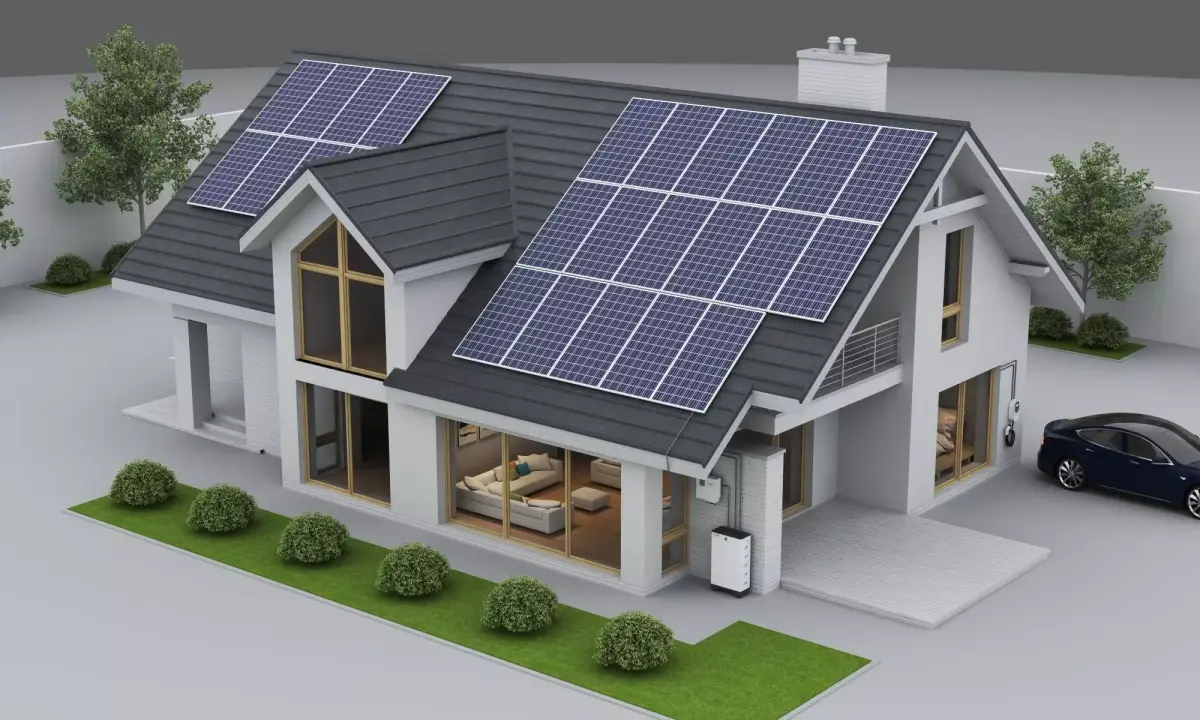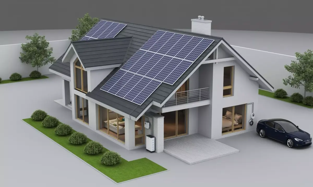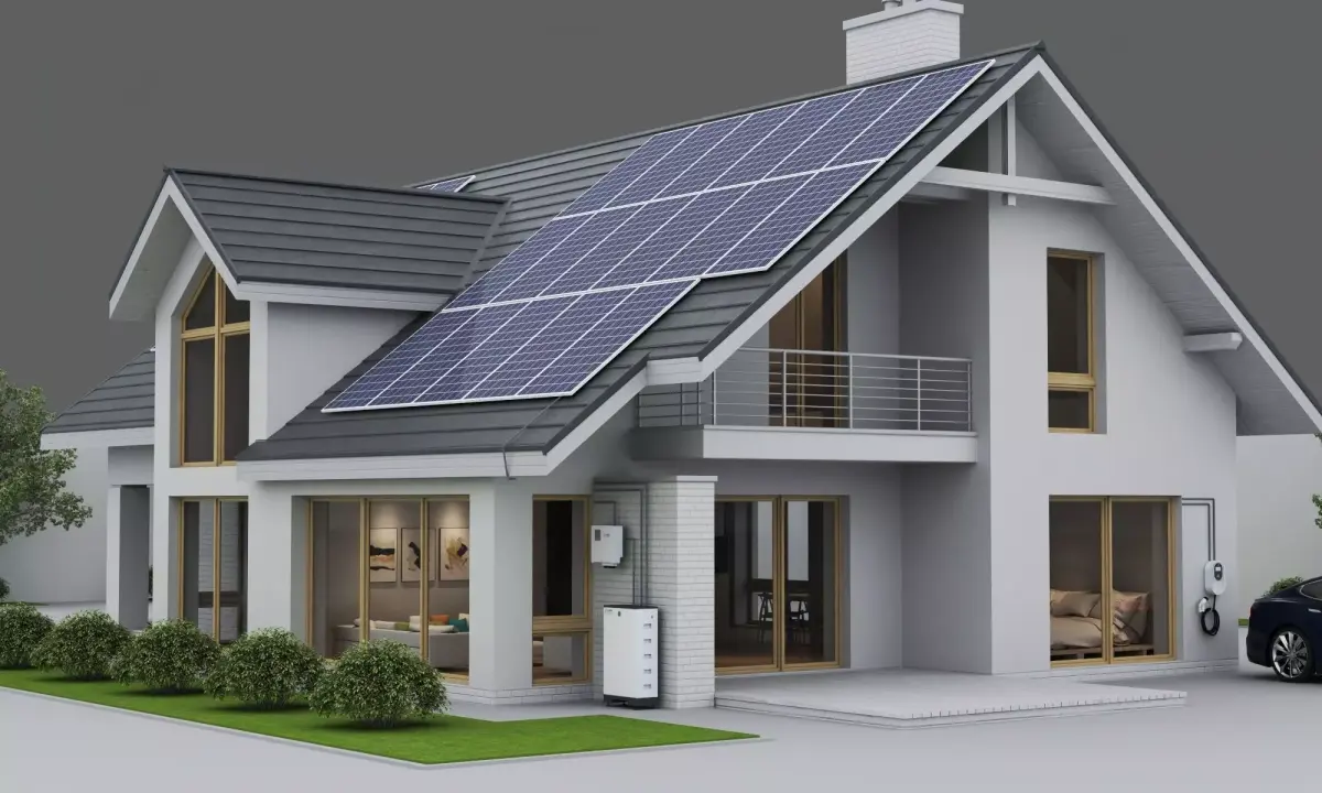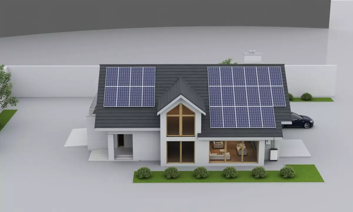 This is a high-quality 3D model of a modern residential house, featuring an eco-friendly design with solar panels and an electric vehicle charging station on the roof.