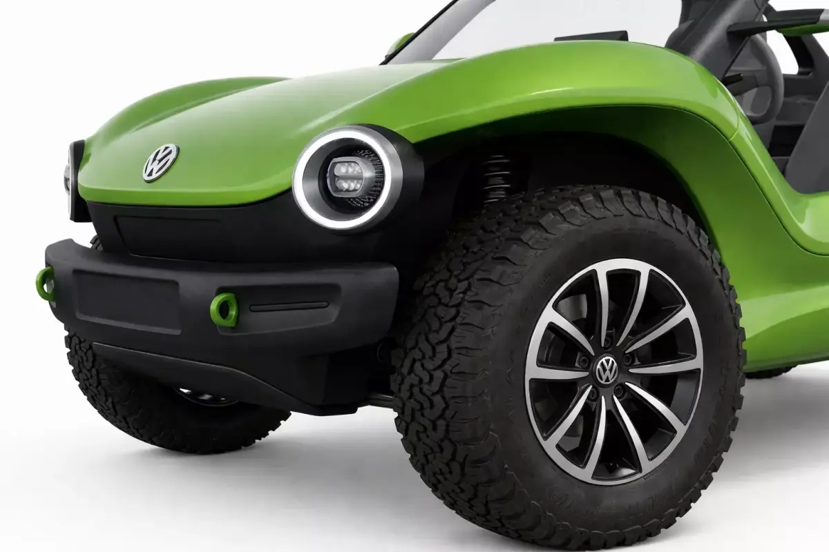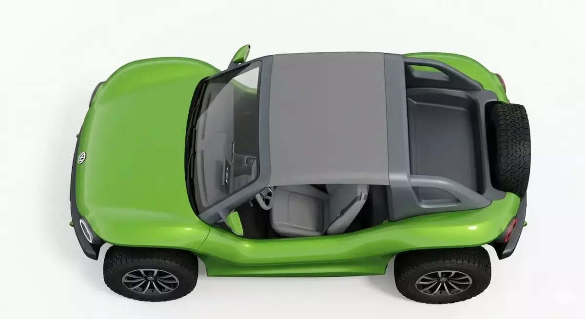 This high-quality 3D model presents a modernized electric off-road buggy, inspired by classic coastal lifestyle vehicles and contemporary EV design language. The asset features a vibrant lime-green metallic body with a minimalist, doorless open-shell configuration and a matte black reinforced roof structure. Its design is characterized by friendly, rounded proportions, including distinctive circular LED headlights and a clean front fascia. The model is built for adventure, showcasing high-clearance suspension, rugged all-terrain tires mounted on premium multi-spoke alloy wheels, and a rear-mounted full-size spare. The interior is detailed with weather-resistant grey bucket seats and a streamlined digital dashboard. This 3D asset is perfectly suited for beach-themed environmental renders, lifestyle-oriented automotive visualizations, or as a unique drivable vehicle in modern open-world game titles.