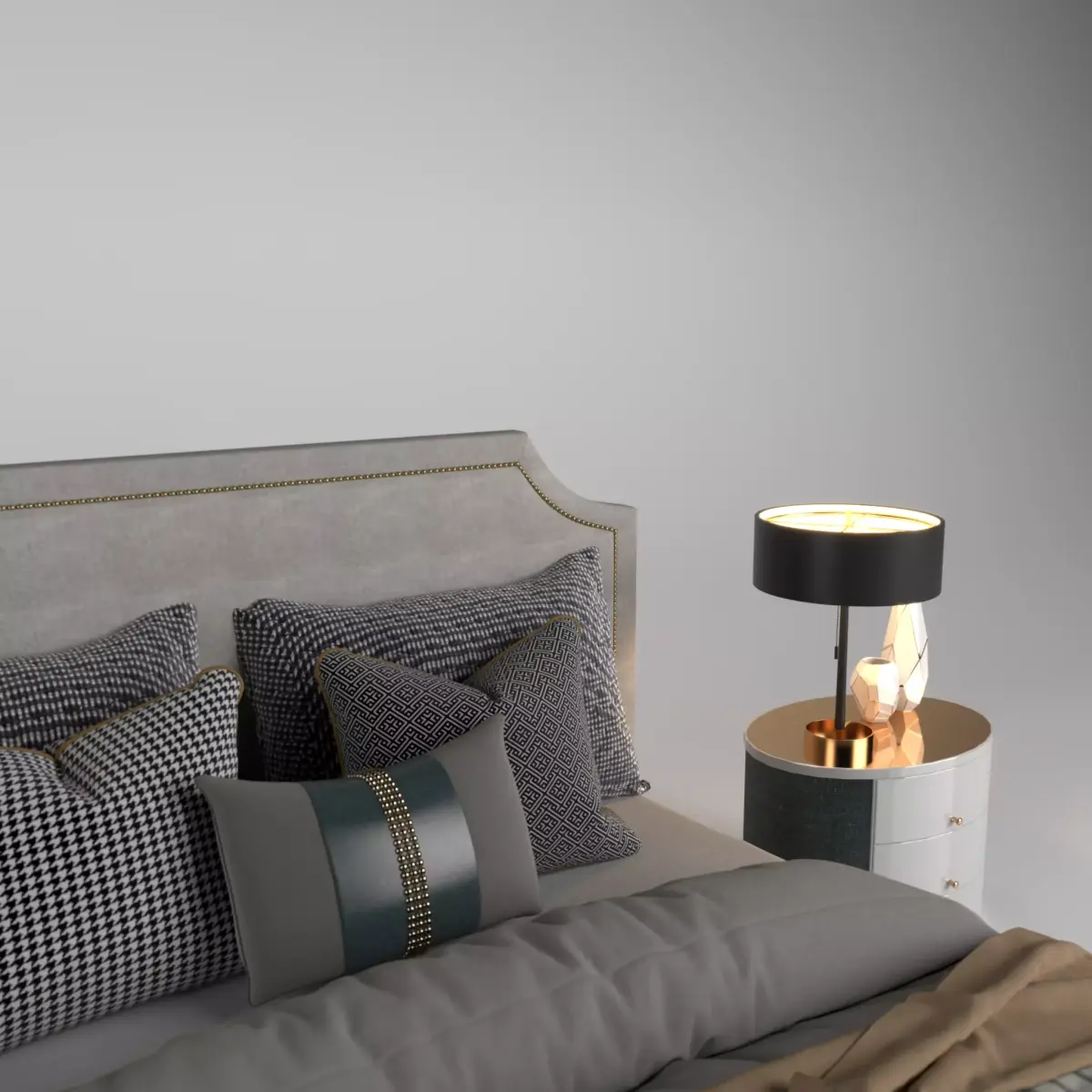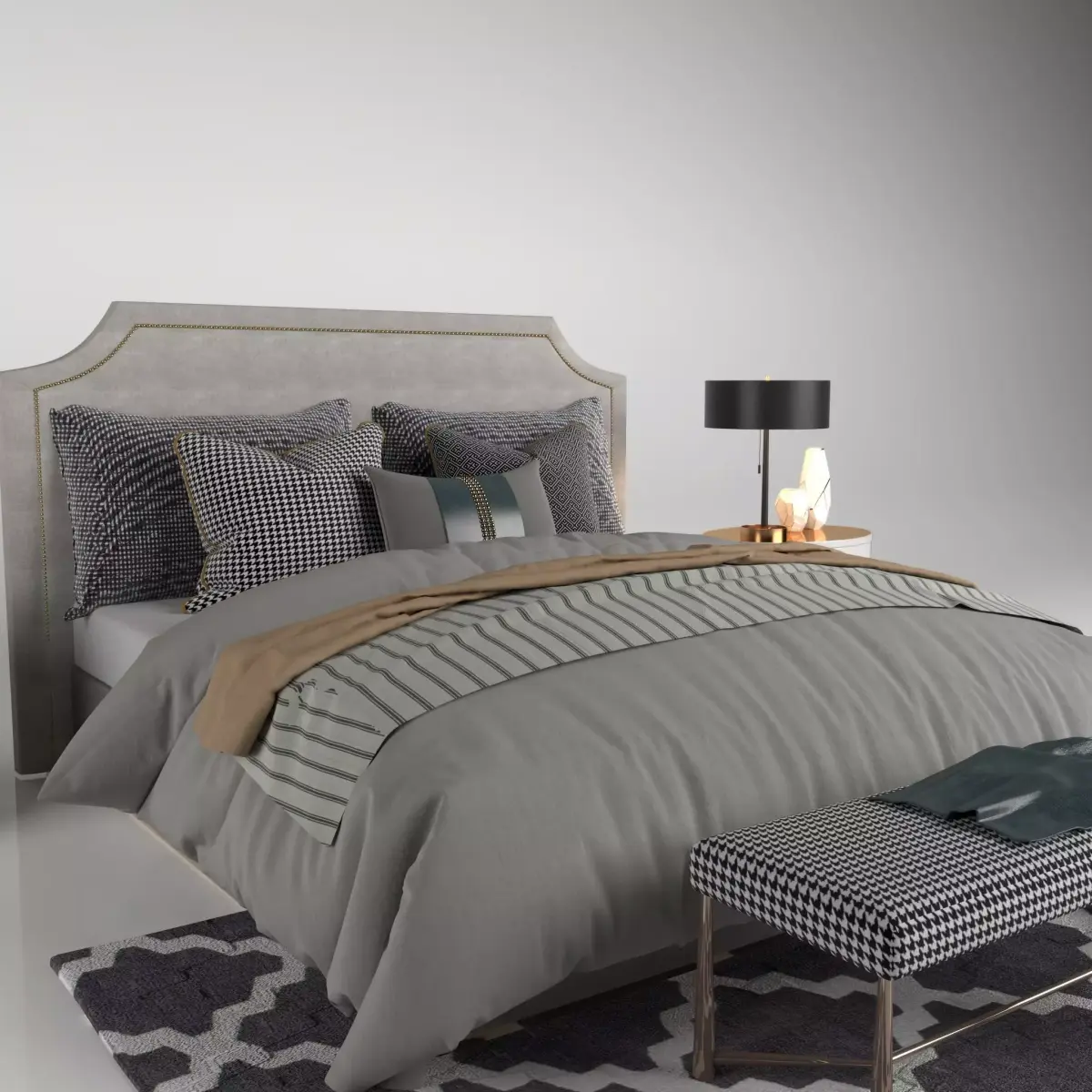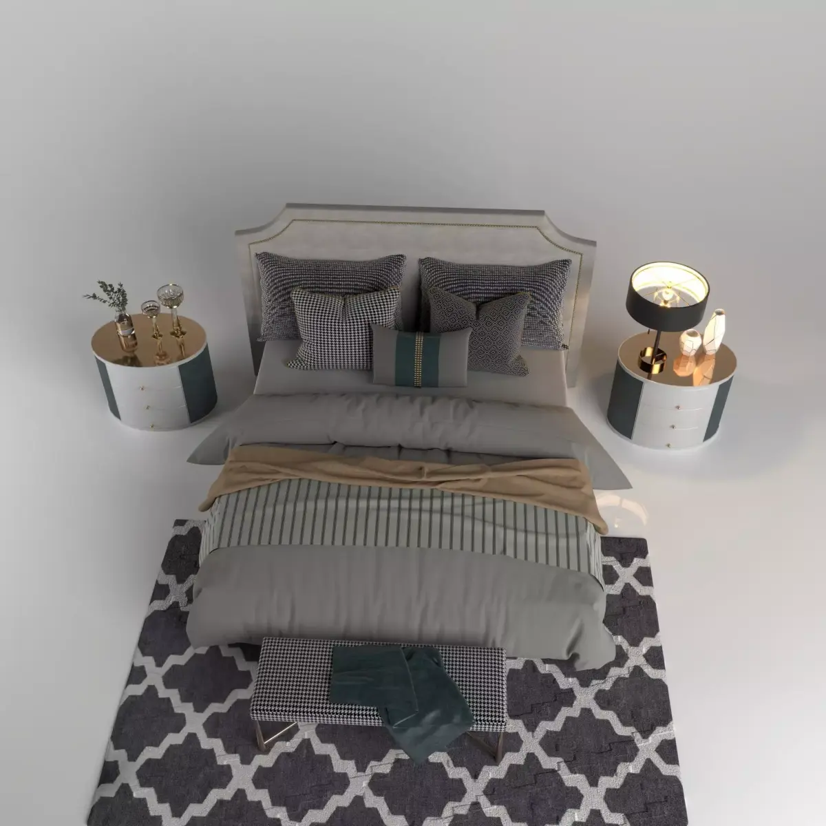 A stylish modern bedroom scene designed with a soft, elegant color palette of grey, beige, and gold. The model includes a fully detailed bed with layered bedding, patterned pillows, side tables with decor accessories, lamps, and a rug with geometric patterns.Perfect for realistic interior renders and close-up shots.