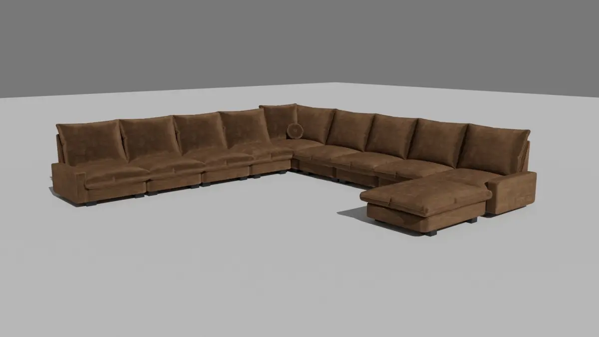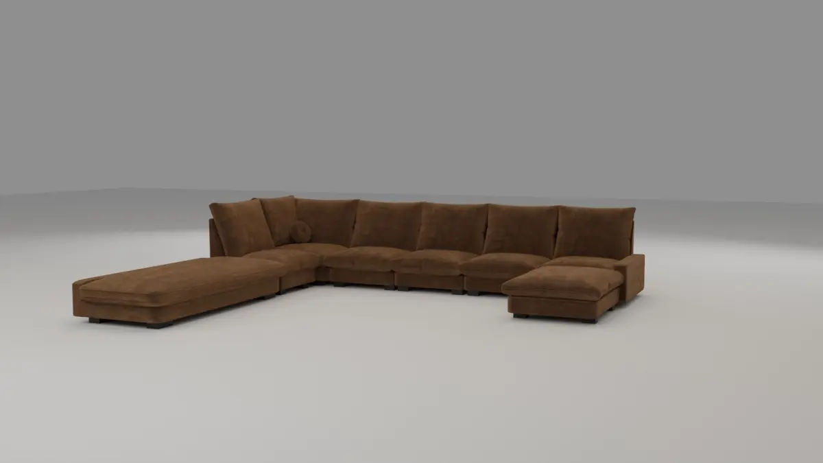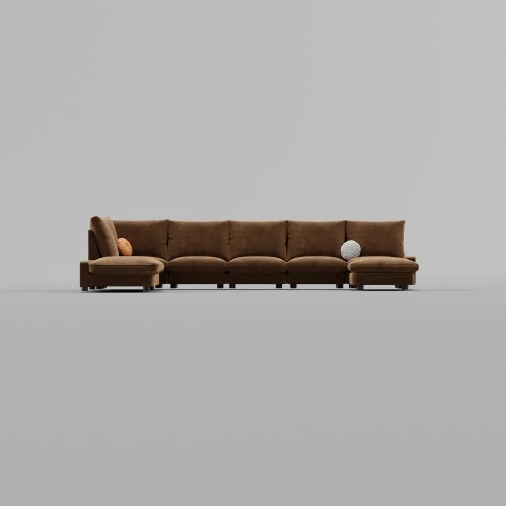 Color and Material:The sofa is upholstered in a rich brown fabric or leather, giving it a warm and inviting appearance.The material appears to be high-quality and durable.Shape and Configuration:It is an L-shaped sectional, providing ample seating space.The chaise portion extends on one side, allowing for comfortable lounging.Design Details:Clean lines and a streamlined silhouette emphasize modern aesthetics.Square arms strike a balance between comfort and style.Back cushions are likely plush and supportive for a cozy experience.Minimalist Appeal:The lack of excessive ornamentation or decorative elements contributes to its minimalist charm.