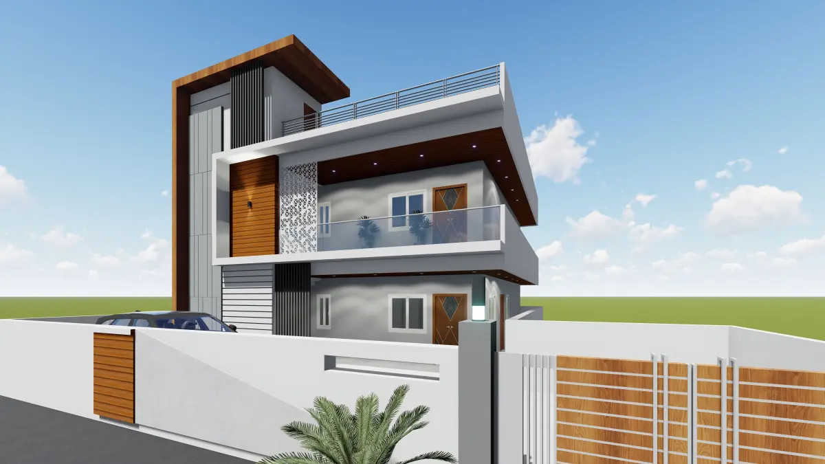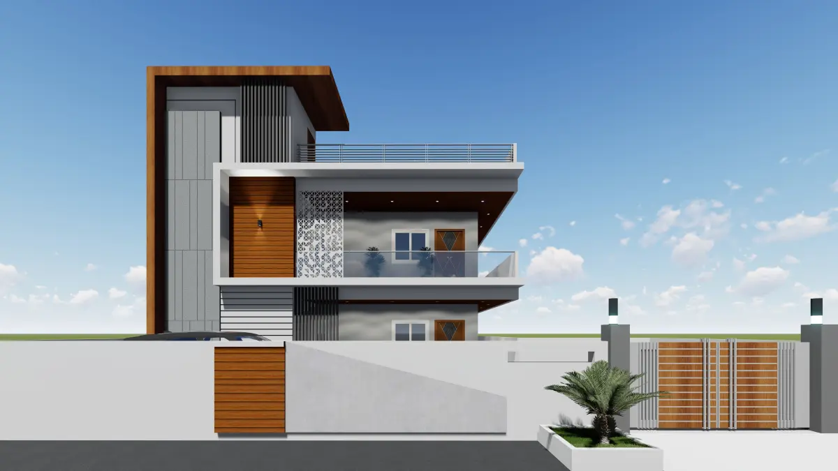The design of a structures front elevation does not just make it visually attractive, it adds sustainability and financial value. Balance is another crucial element to have in your architectural elevation design. Balance here is created by colour and design form. Elevations are important in for ones living in the house for their identification, The wooden panelling, textured painting, cnc cut design, neutral colour scheme, grooved design, manufactured rafters, compound wall and gate design are just a few of the contemporary design's features that enhance the elevation's overall appearance. #cgtp-11 #p-39