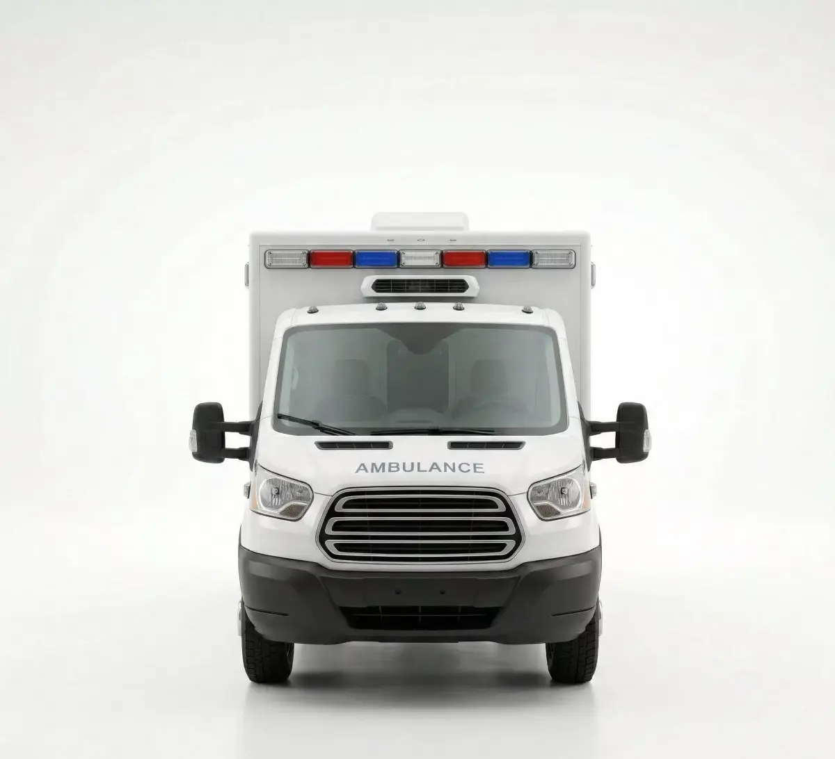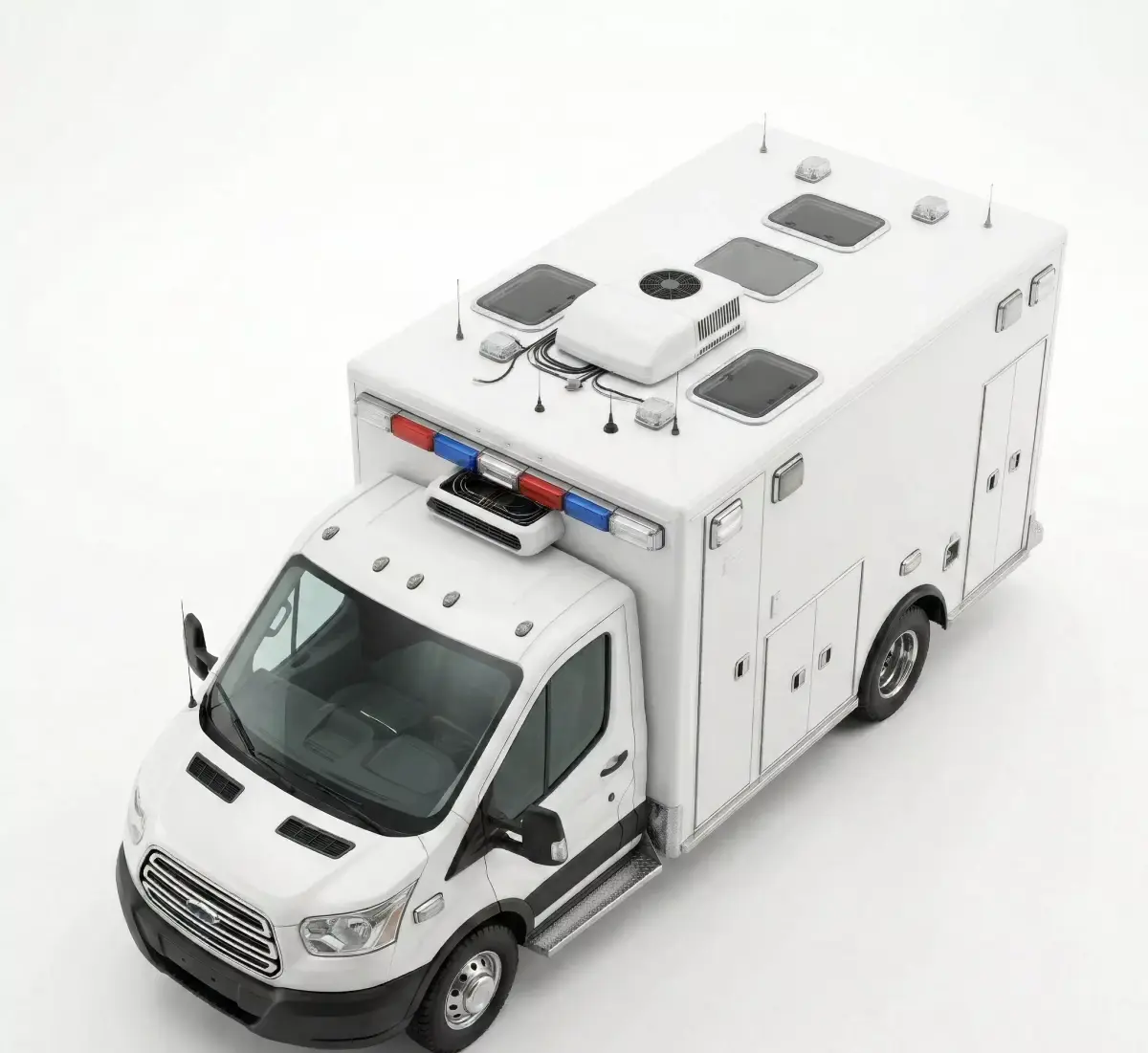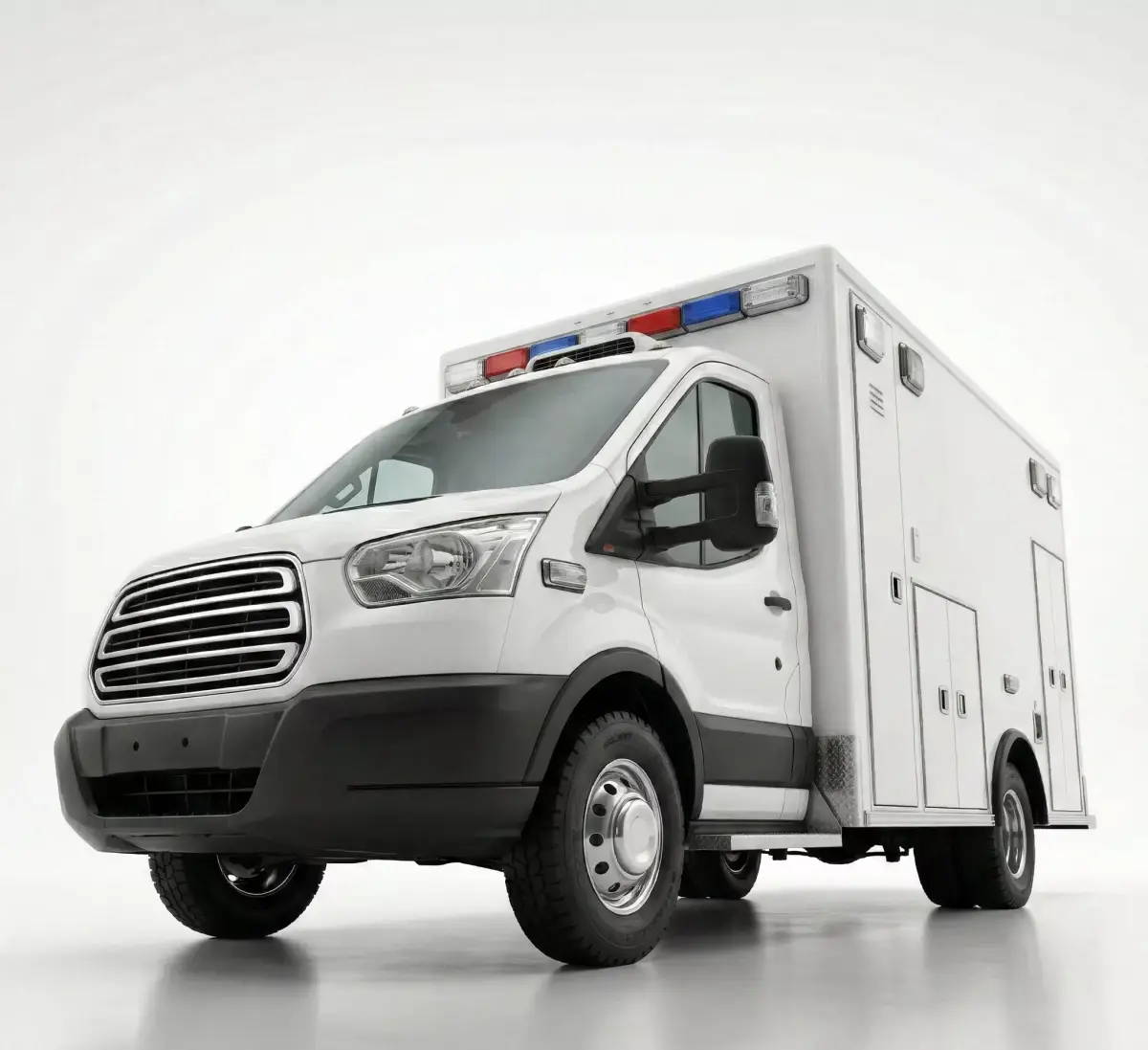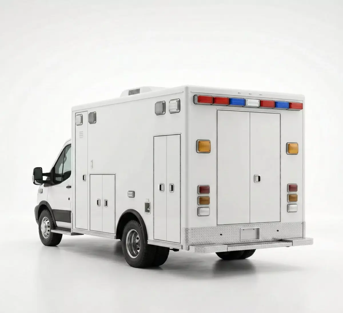 This high-fidelity 3D model depicts a modern Type III emergency ambulance, meticulously designed for realism in urban and medical visualizations. Built on a contemporary cutaway van chassis, the vehicle features a stark white finish equipped with essential emergency components, including a rooftop air conditioning unit and an integrated LED light bar with authentic red and blue coloring. The box-style patient compartment is detailed with various external access lockers, chrome-accented handles, and high-visibility rear lighting. With precision rendering of the front grille, side mirrors, and heavy-duty wheels, this asset is an ideal choice for emergency service simulations, architectural renders of hospital environments, or as a critical vehicle prop in modern open-world gaming.