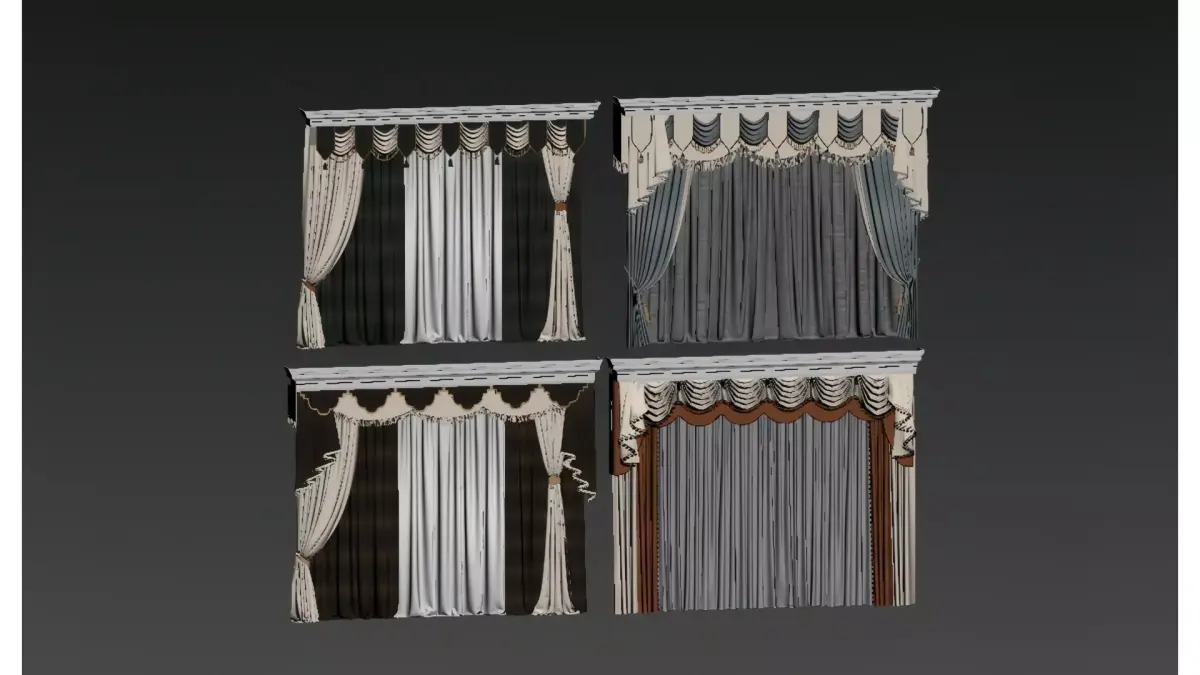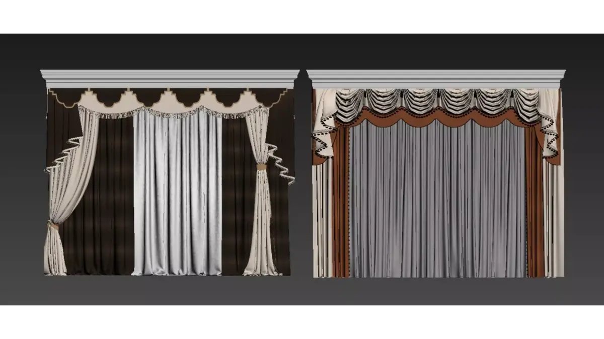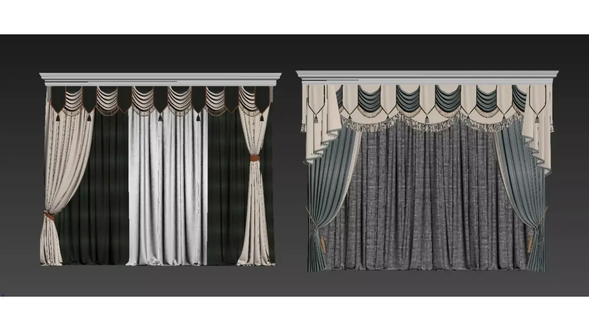 This set of curtains adopts a light luxury modern European style, mainly made of silky texture fabrics, and matched with exquisite curtain valances (wavy/pleated design + tassel/tassel decorations). It presents a high-end aesthetic through color-block combinations (emerald green + off-white, light blue + grayish white, dark brown + cream white, caramel brown + off-white).Suitable for the soft decoration collocation of spaces such as living rooms and bedrooms, these curtains combine light-shielding performance with decorative effect and are a representative design of high-end custom soft furnishings.