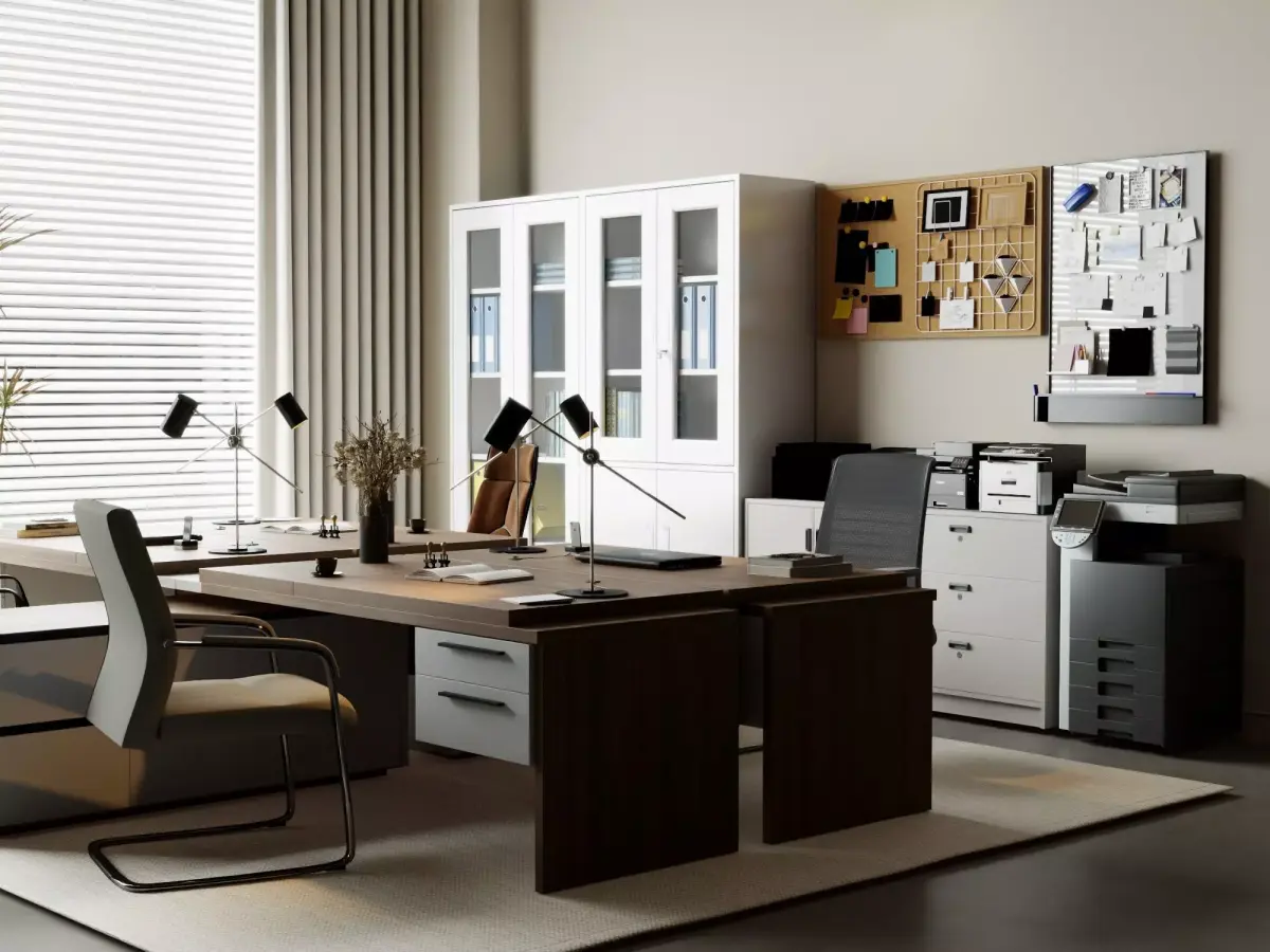 High-detail Modern Executive Office Desk Scene 3D Model – luxurious contemporary workspace setup!This photorealistic office interior features a spacious L-shaped executive desk in warm wood tones with white accents, integrated storage drawers, and minimalist design. Includes executive leather chair (brown and gray variants), task lamps (black adjustable), laptop (Dell-inspired), open notebook, coffee cup, dried flower vase, scattered stationery, and realistic props like books and paperclips. Background elements: tall white filing cabinets, multi-function printers, cork bulletin board with notes/pins, potted plants, vertical blinds, and neutral wall/floor for easy integration.Modeled in 3ds Max with V-Ray for high-quality photoreal renders. Clean topology, PBR-ready materials, high-resolution textures, real-world scale. Perfect for architectural visualization (Archviz), office interior renders, product presentations, corporate scenes, game environments, VR/AR setups, animations, and concept art.Supported file formats: